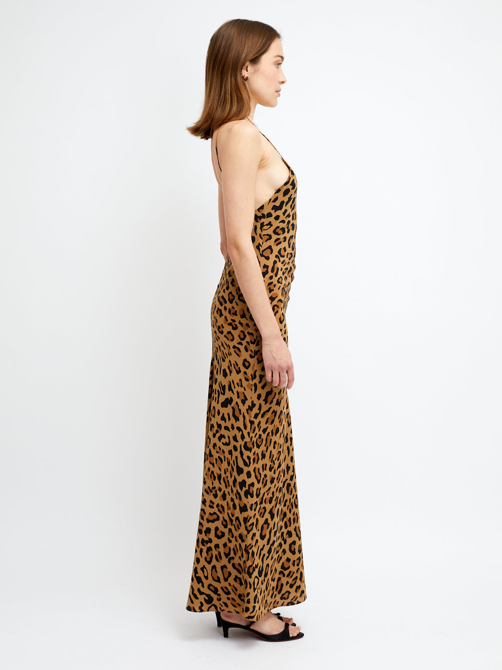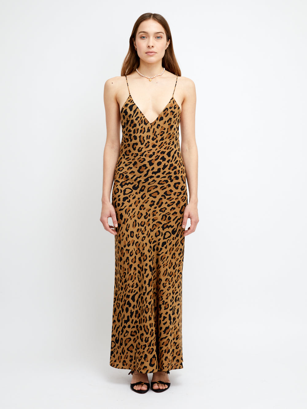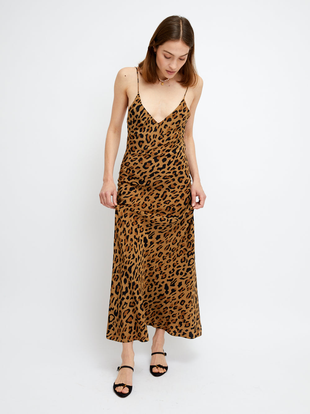Simba Manipur dress by Blazé Milano made from leopard print silk. A long, lingerie-style dress with an irresistible plunging back.