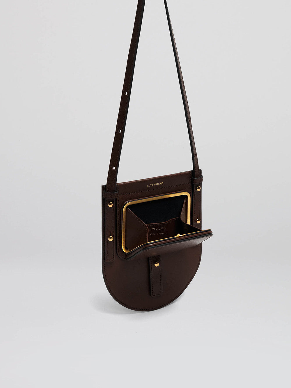 Le sac Porter Chocolate Cooper signé Lutz Morris confectionné en cuir lisse marron foncé. Un petit sac accompagné d'une poche sur le devant pouvant contenir des cartes.