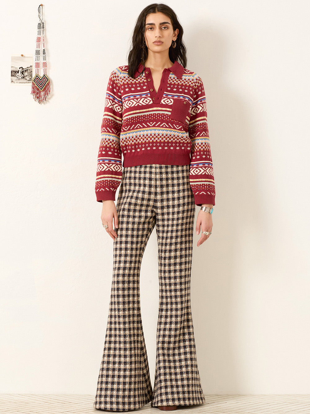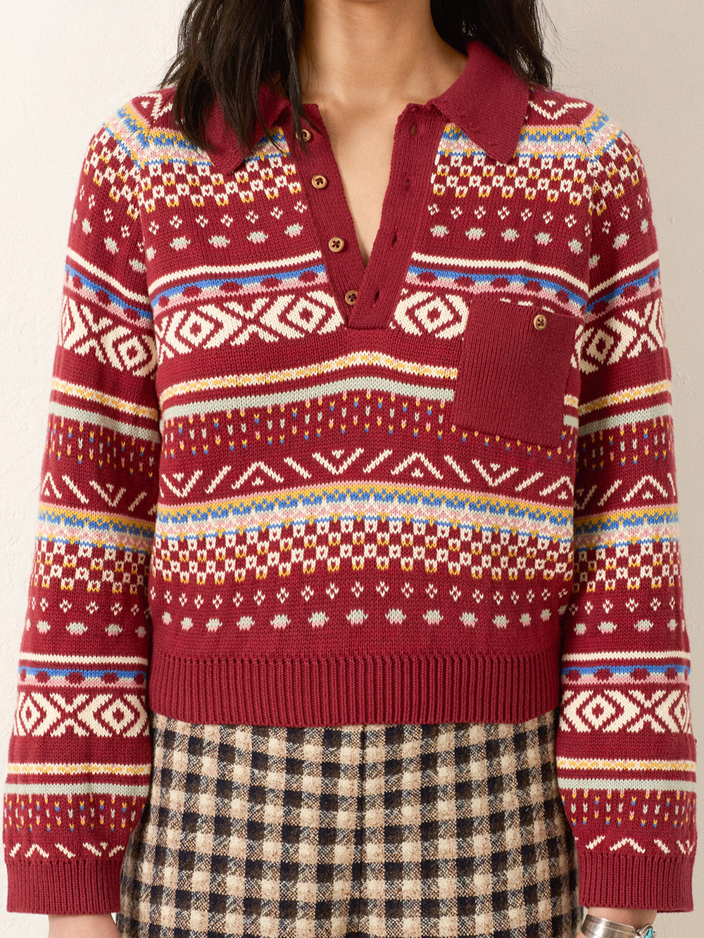 Alix of Bohemia's Liza Mesa Fair Isle sweater is crafted from a burgundy knit featuring a multi-colored fair isle pattern. A cropped polo-style sweater with a button-down collar.