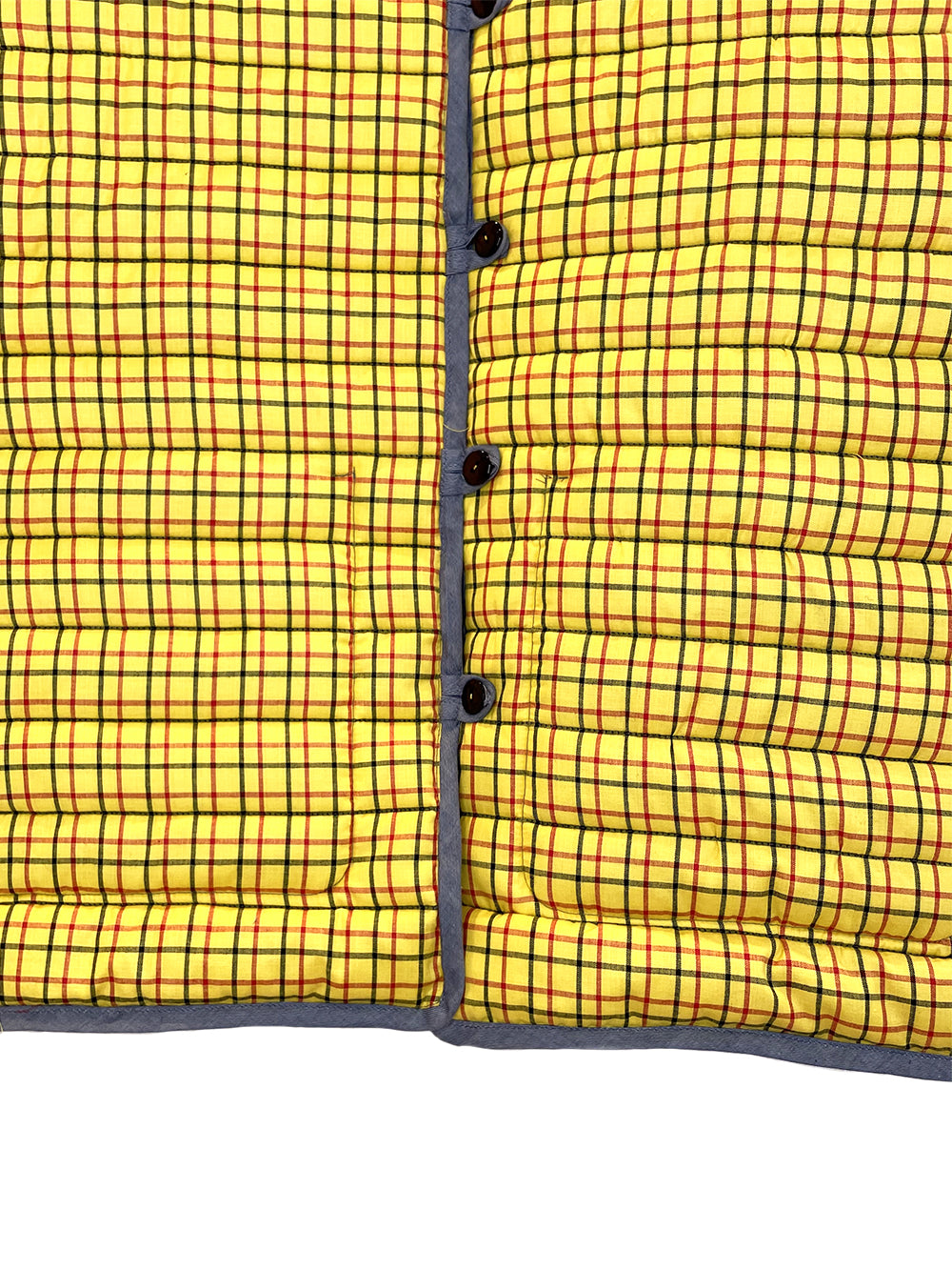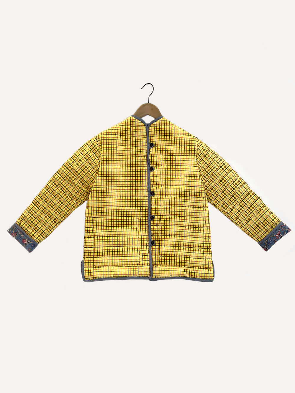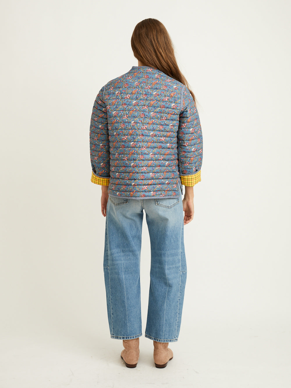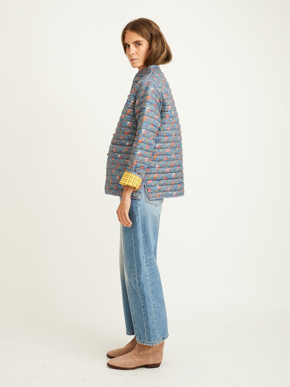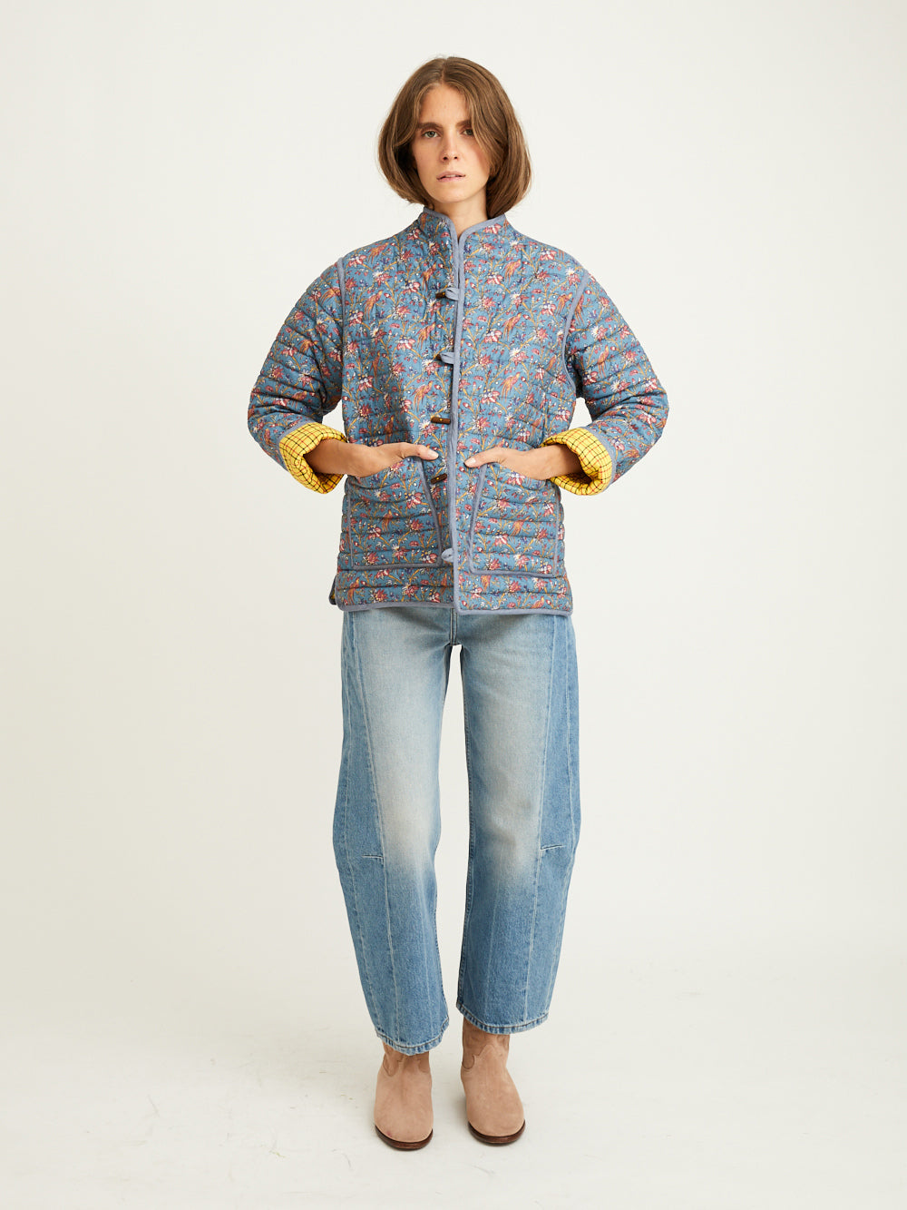 This quilted cotton jacket is reversible, with blue flowers on one side and yellow check print on the reverse. It has a short and straight cut with a nice curve in the back, contrasting trims, slits on the sides as well as patch pockets on the front. This piece has glazed brown buttons and Oeko-Tex Standard 100 certified bias binding (i.e. the composition does not present any products harmful to health). All 1648 Paris jackets are made in a social reintegration workshop. The items are made by hand, so there may be some small irregularities. This jacket is exclusive to BY MARIE.