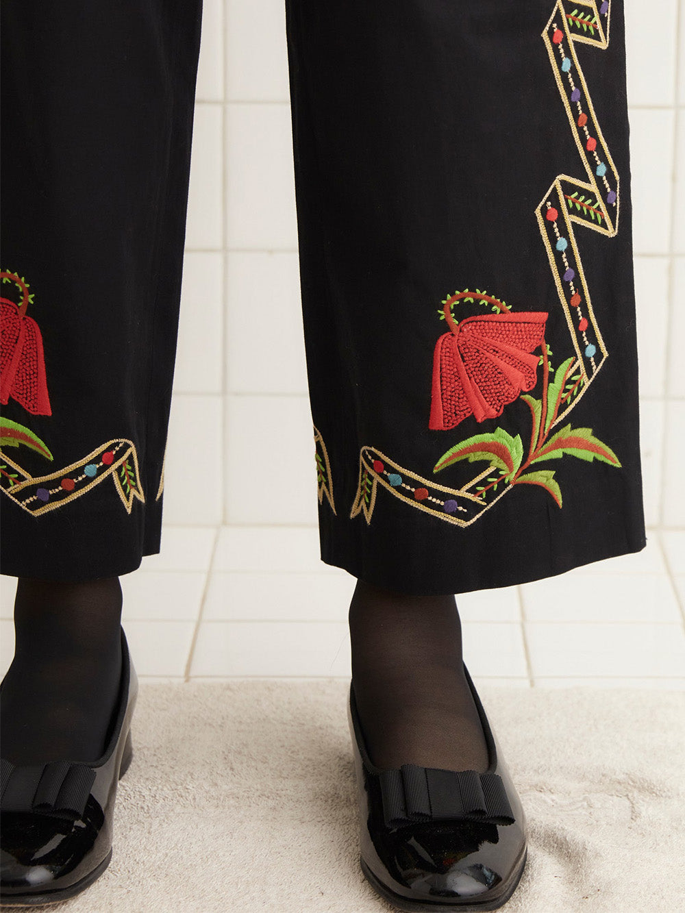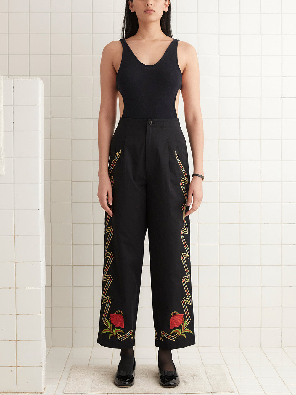 Bode's Hollyhock Ribbon Pants are crafted from black cotton. Featuring 1900s-inspired embroidery. Mid-rise, wide-leg pants.