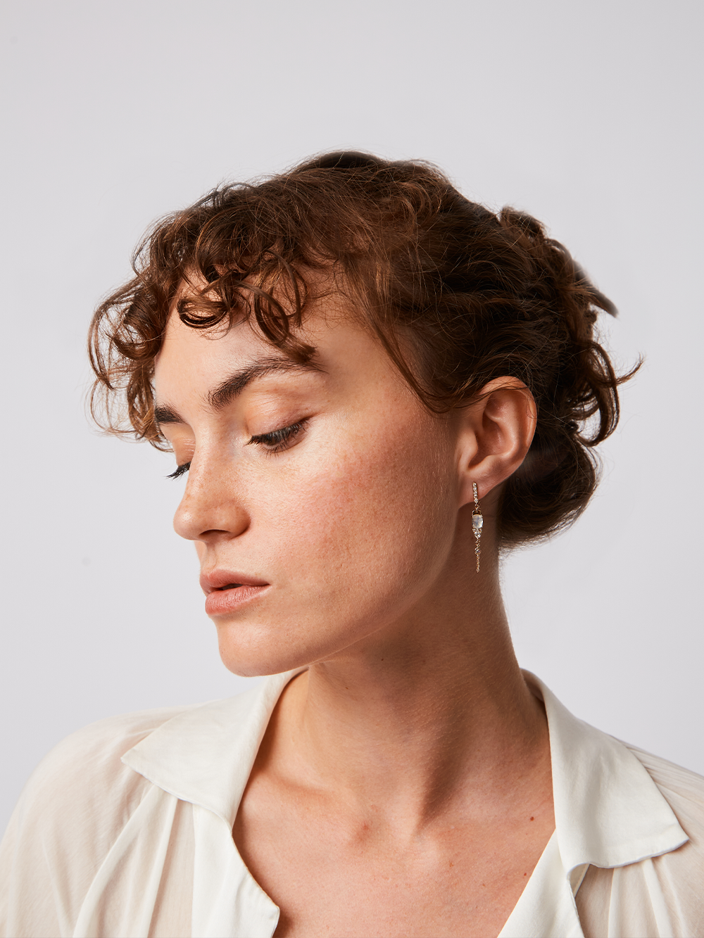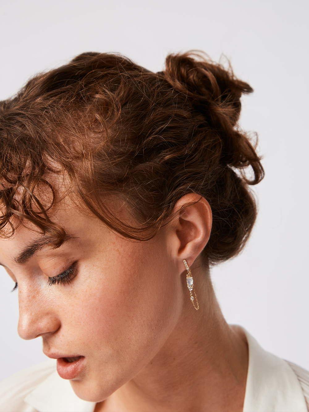 The pair of 14-carat long yellow gold Moonstone earrings is made by Céline Daout. The moon stones in the center form a degraded light and iridescent tones. Diamants are found on either side of the loop. Each gemstone has been hand-selected by Céline Daoust during her travels abroad.