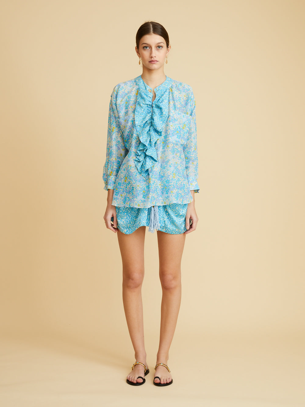 This Flower Bouquet print Frill shirt is made from a lightweight silk. Ses mlong reeds arrive just above the wrists, the cuffs are buttoned, the blouse offers a loose fit, a round neck, a chest pocket and large ruffles on the front.