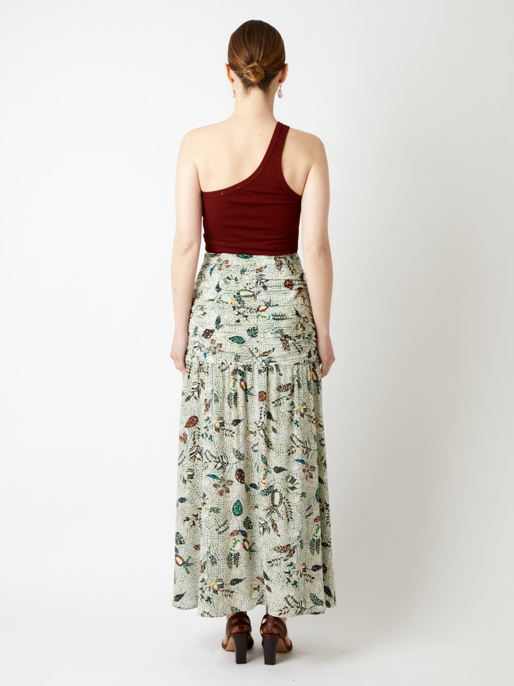 Ulla Johnson's Georgina skirt is crafted from silk crepe with a green botanical motif. The style has a feminine silhouette with gathers at the waist and hips, and asymmetrically cascading ruffles. Wear it with the Ashlyn blouse for a head-to-toe look.