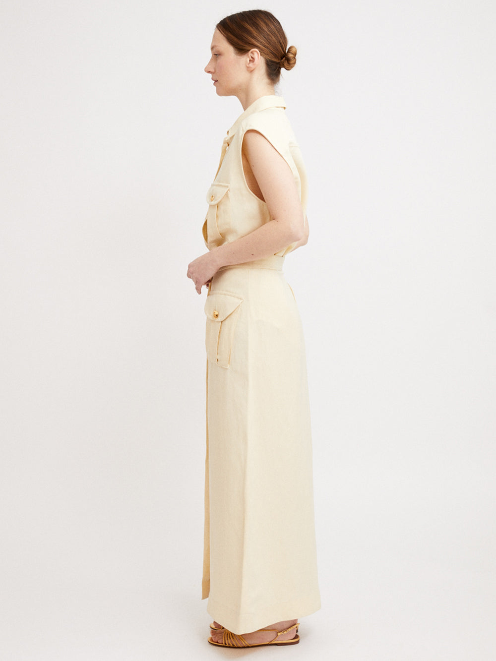 This Appaloosa Savannah skirt by Blazé Milano is made from pale yellow linen. A high-waisted midi skirt with a slightly flared cut.