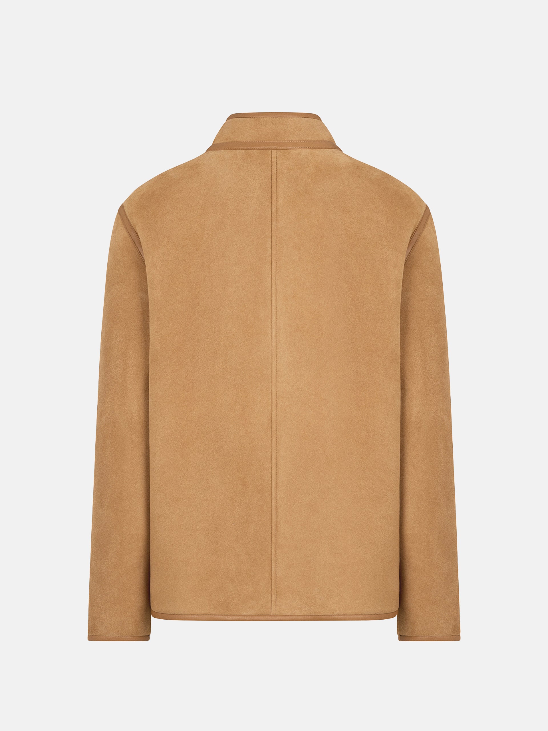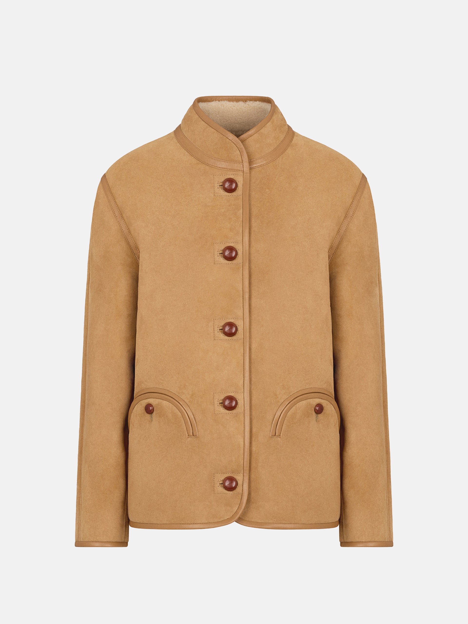 Blazé Milano's Tatoosh Curly jacket is crafted from camel-colored lambskin. A mandarin collar jacket with brown buttons down the front.