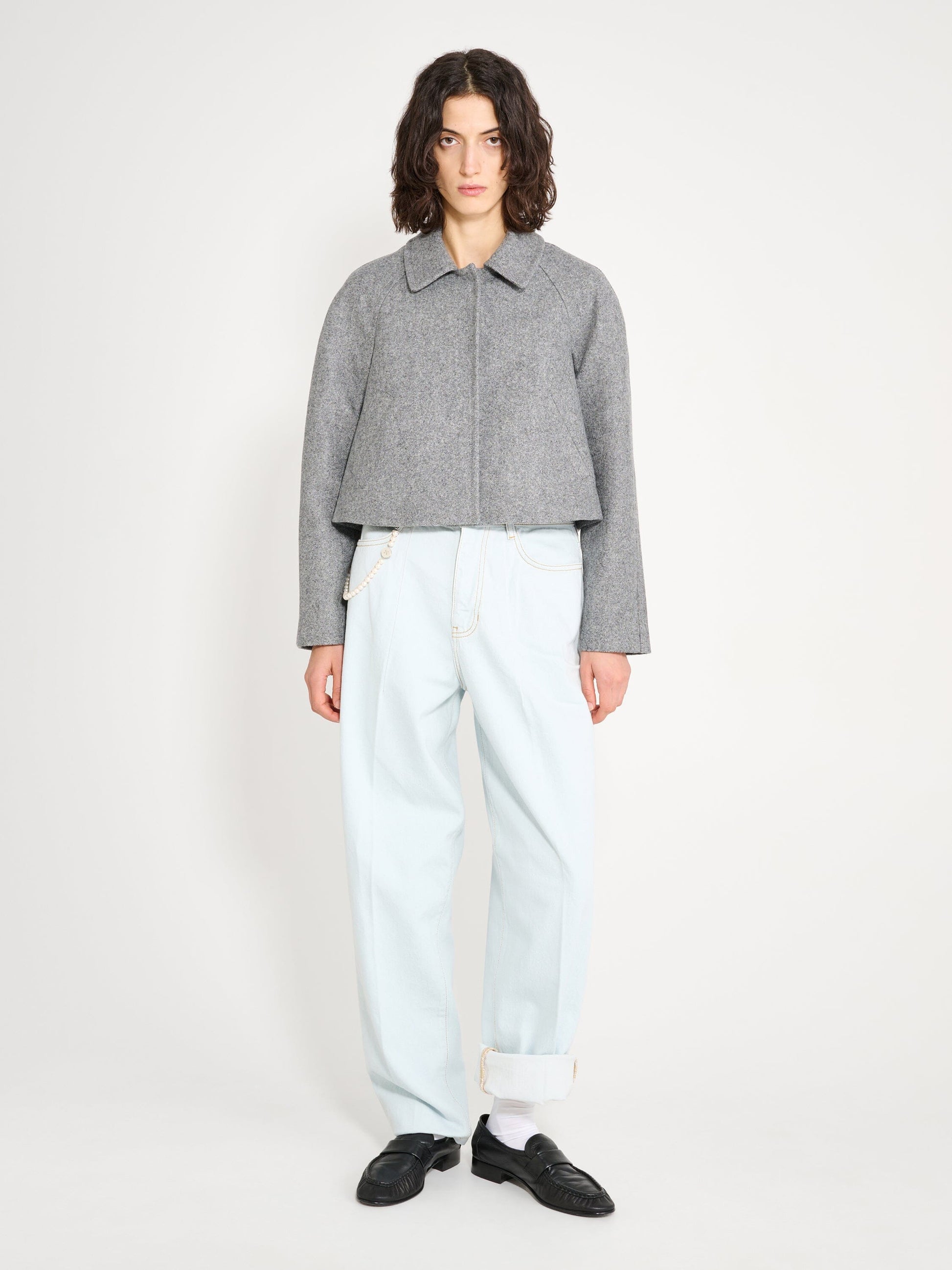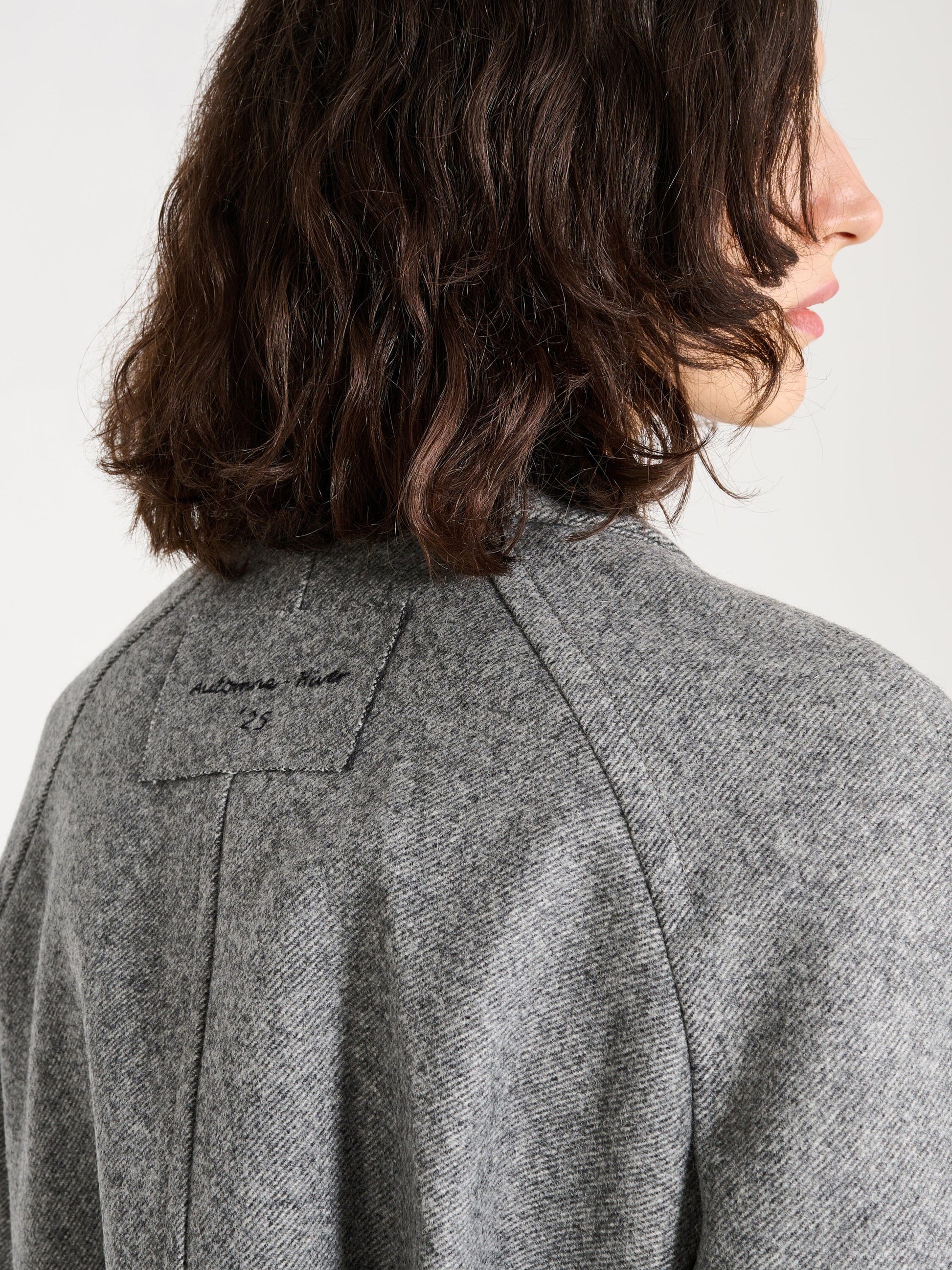 Pixie Grey Jacket by Nackiyé, crafted from grey virgin wool. A cropped jacket with a flared cut and a detachable back belt.