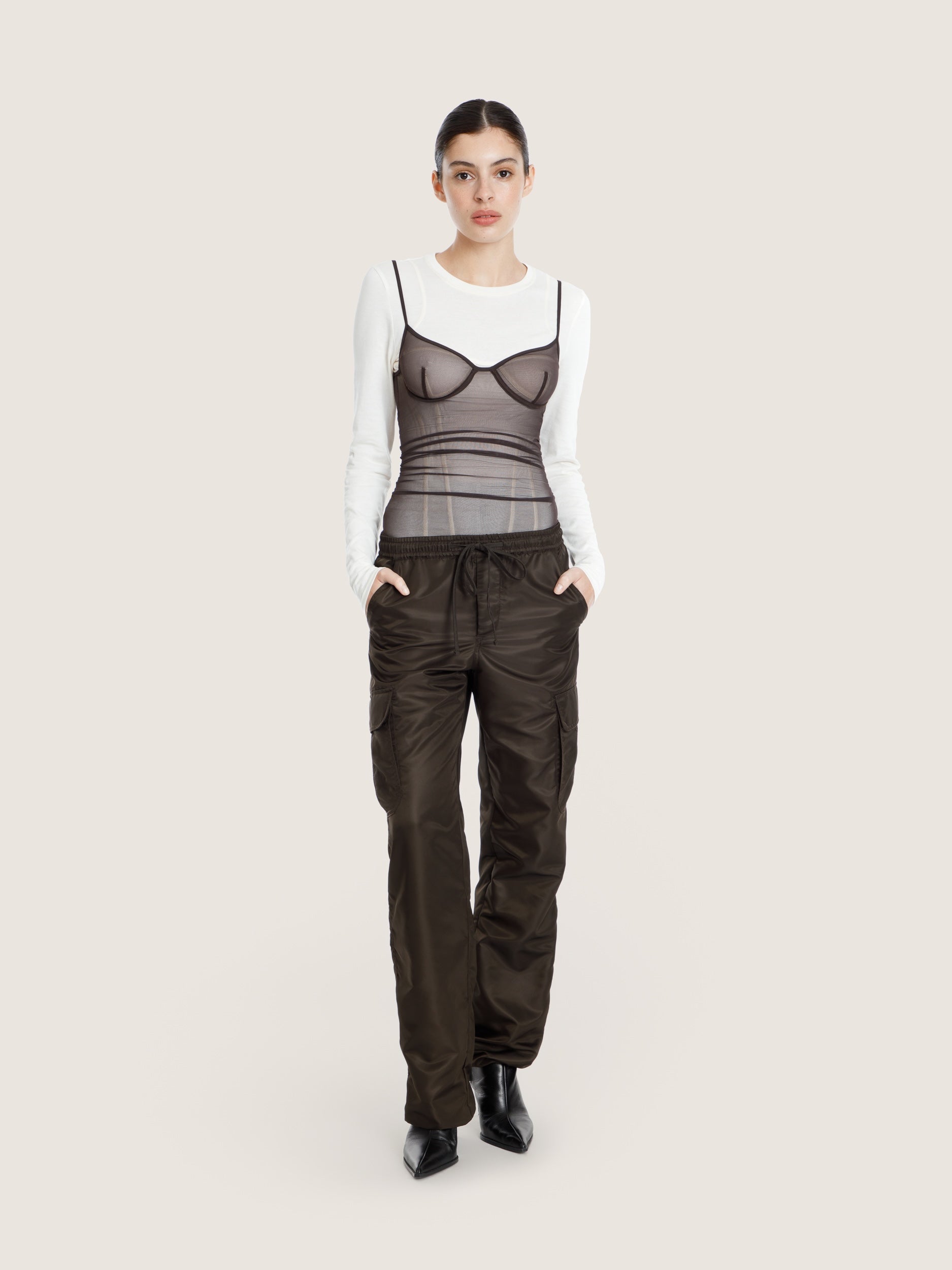 Lingerie tank top by Ernest Leoty, made from brown tulle. A sheer, structured tank top with adjustable straps.