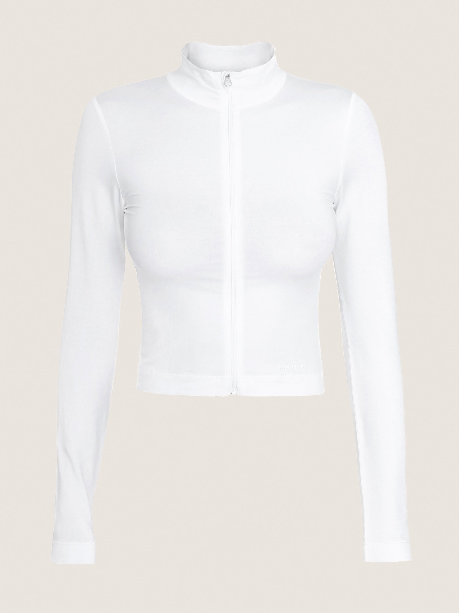 Technical Short Jacket by Ernest Leoty, crafted from white stretch jersey. A short, long-sleeved jacket perfect for loungewear, sports, or everyday wear.