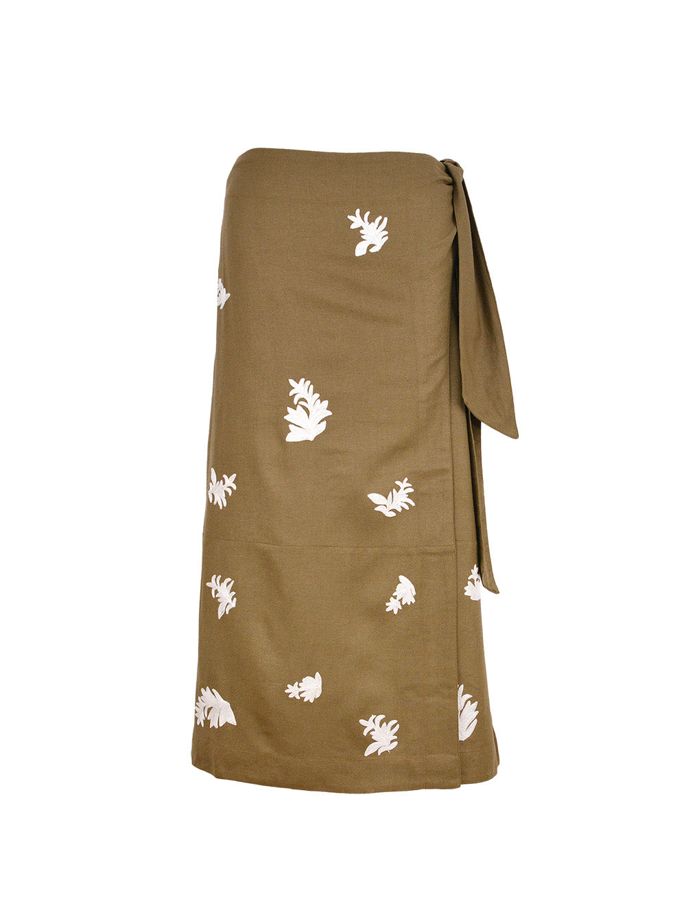 Macha skirt by Monoki, made from khaki-colored silk embroidered with contrasting white floral motifs. A mid-length wrap skirt with a side tie.