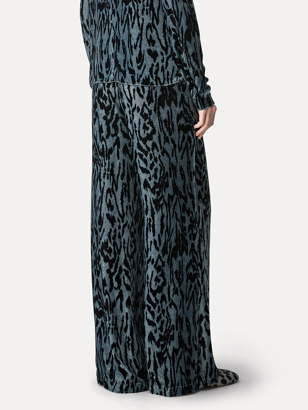 Stone Moiré Velvet Trousers by Forte_Forte. Wide, straight-leg trousers made from an iridescent fabric with sky blue and sea green highlights.