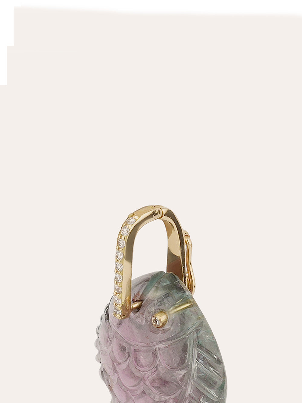 Pendentif Petit Poisson signé Violette Joaillerie confectionnée en tourmaline rose aux bords bleu ciel. Bélière en diamants et saphir rose pendant au niveau de la queue.