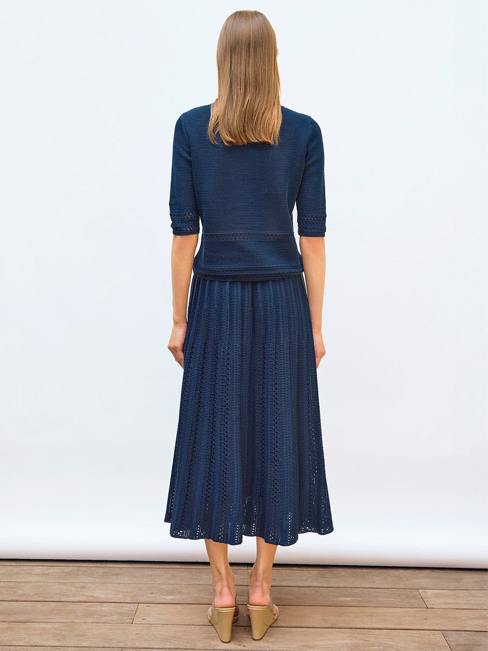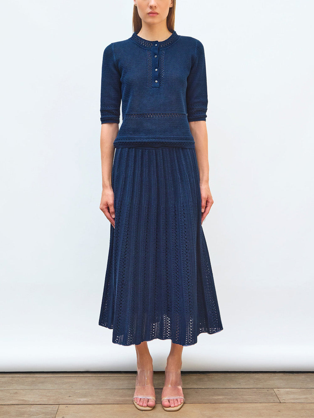 Crochet top by Molli made from dark blue knitted cotton. A crochet-style knitted top with mid-length sleeves.