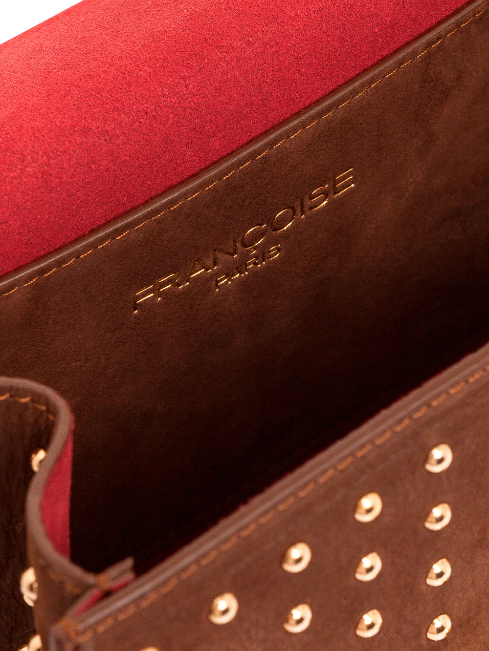 Françoise handbag. This suede leather handbag is decorated with gold rivets and closes with a gold clasp with an engraved F. The piece has a handle for hand carrying and a wide soft leather strap that allows it to be carried on the shoulder.