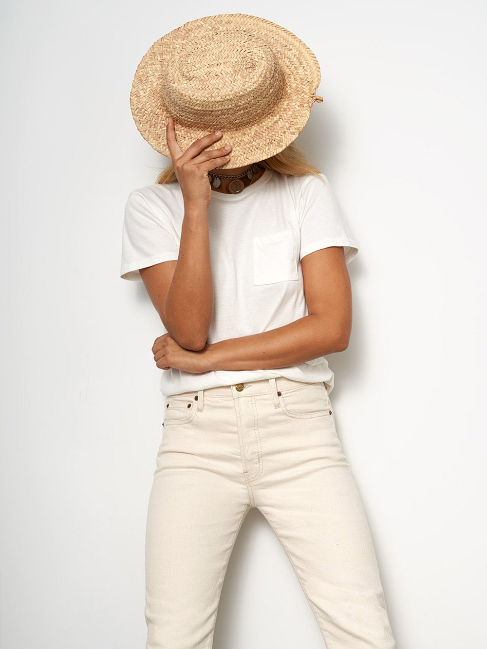 Henri jeans by Bsides. This ivory mid-waist denim has a slim fit with a slim tapered short leg. The denim is stretch and medium weight. The model has four pockets and closes with a zip and button.