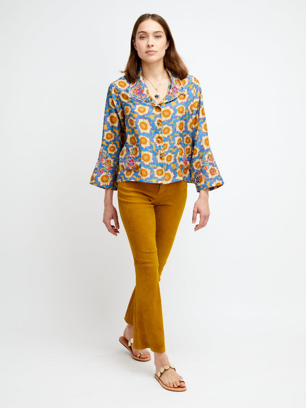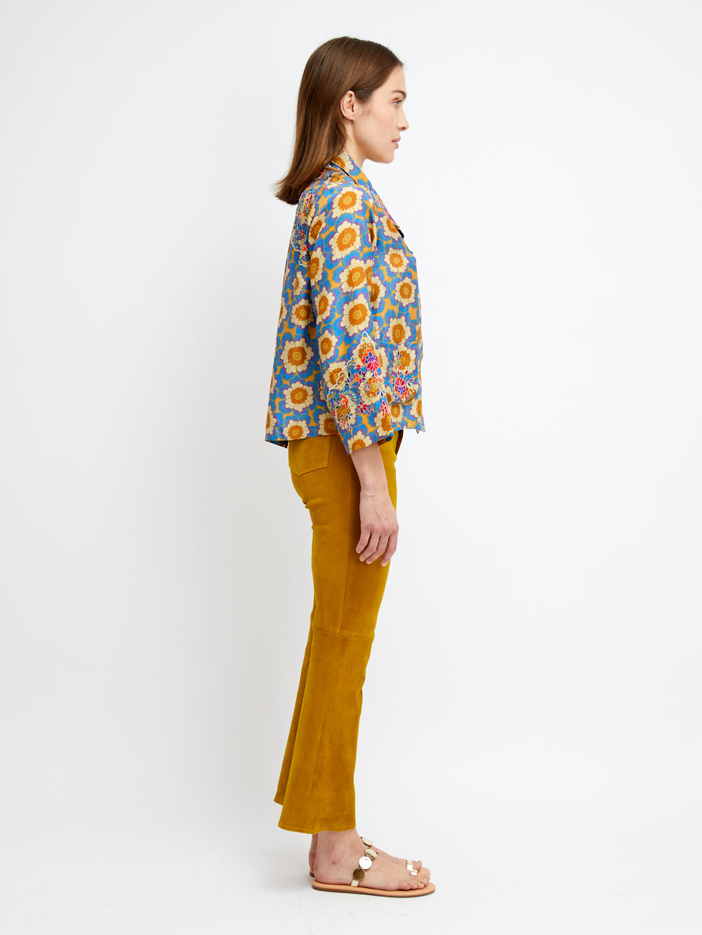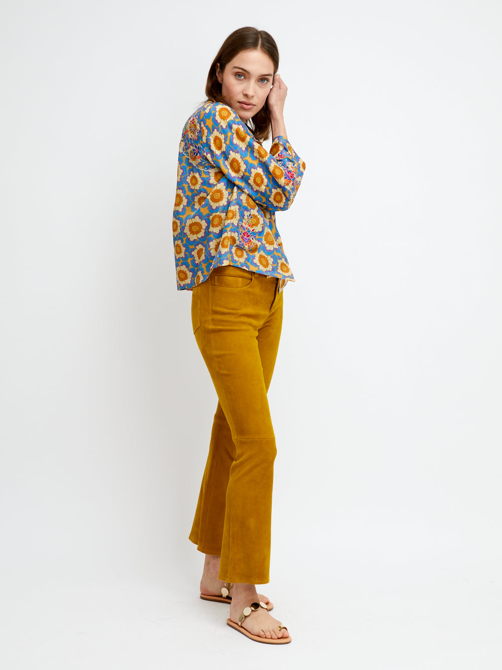 Dean Velvet Pants. These lychee colored trousers are made of stretch leather. The piece has two front pockets and two stitched pockets at the back. They are worn on the hips. The pants are flared at the bottom of the legs and reveal the ankles.