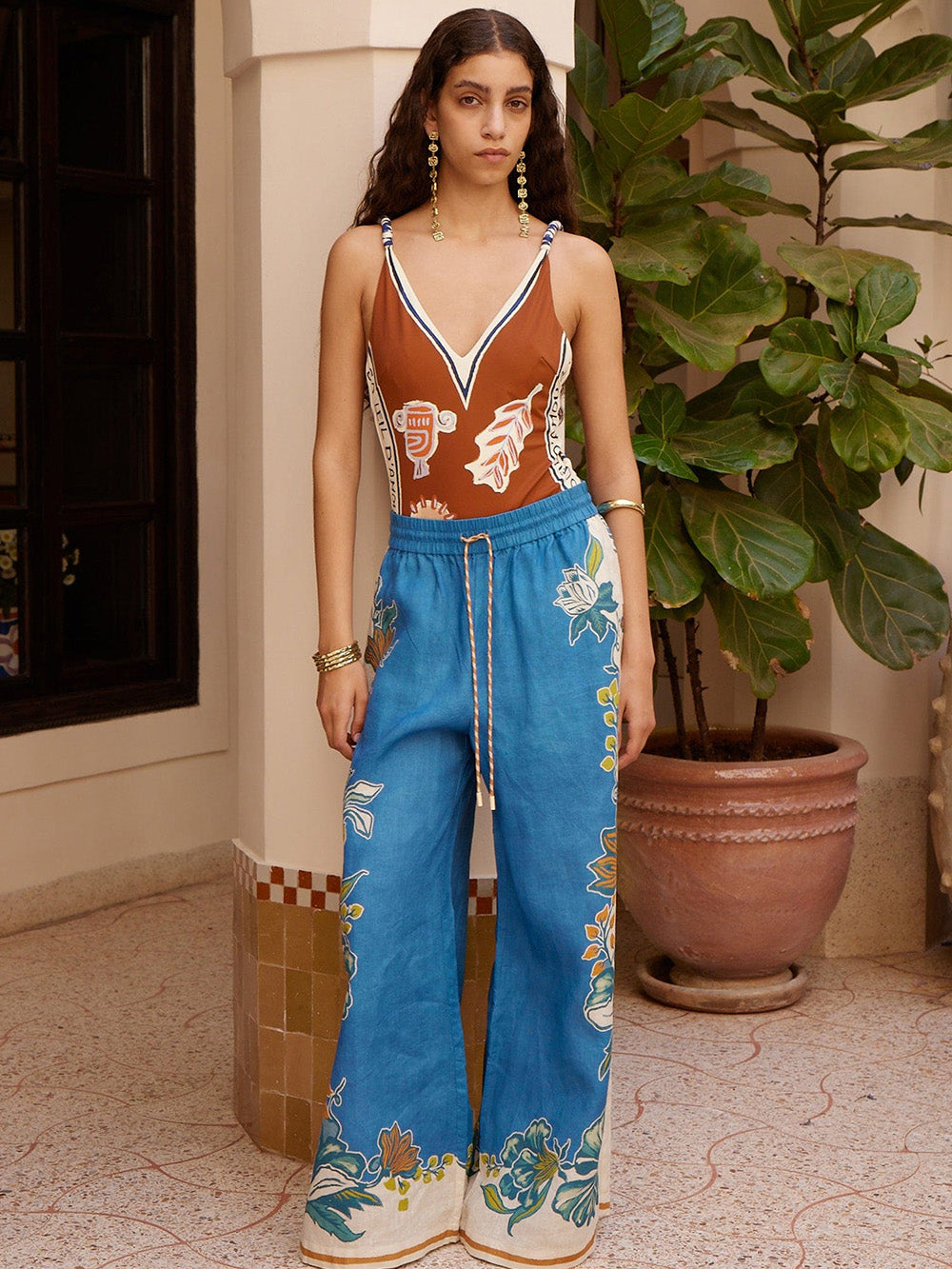 Soleil d'Amour swimsuit by Alémais, crafted from a burnt orange stretch fabric printed with motifs evocative of Mediterranean countries. A one-piece swimsuit with a plunging open back and blue and white twisted straps.