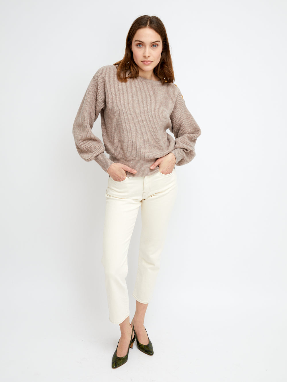 Niki Toast sweater by By Marie Collection made from a dark beige English cashmere knit. BY MARIE cashmeres are made in limited series by hand and using an old knitting machine in an organization in Nepal that has existed for 20 years. This company is mainly made up of women and, like us, is committed to passing on quality know-how.
