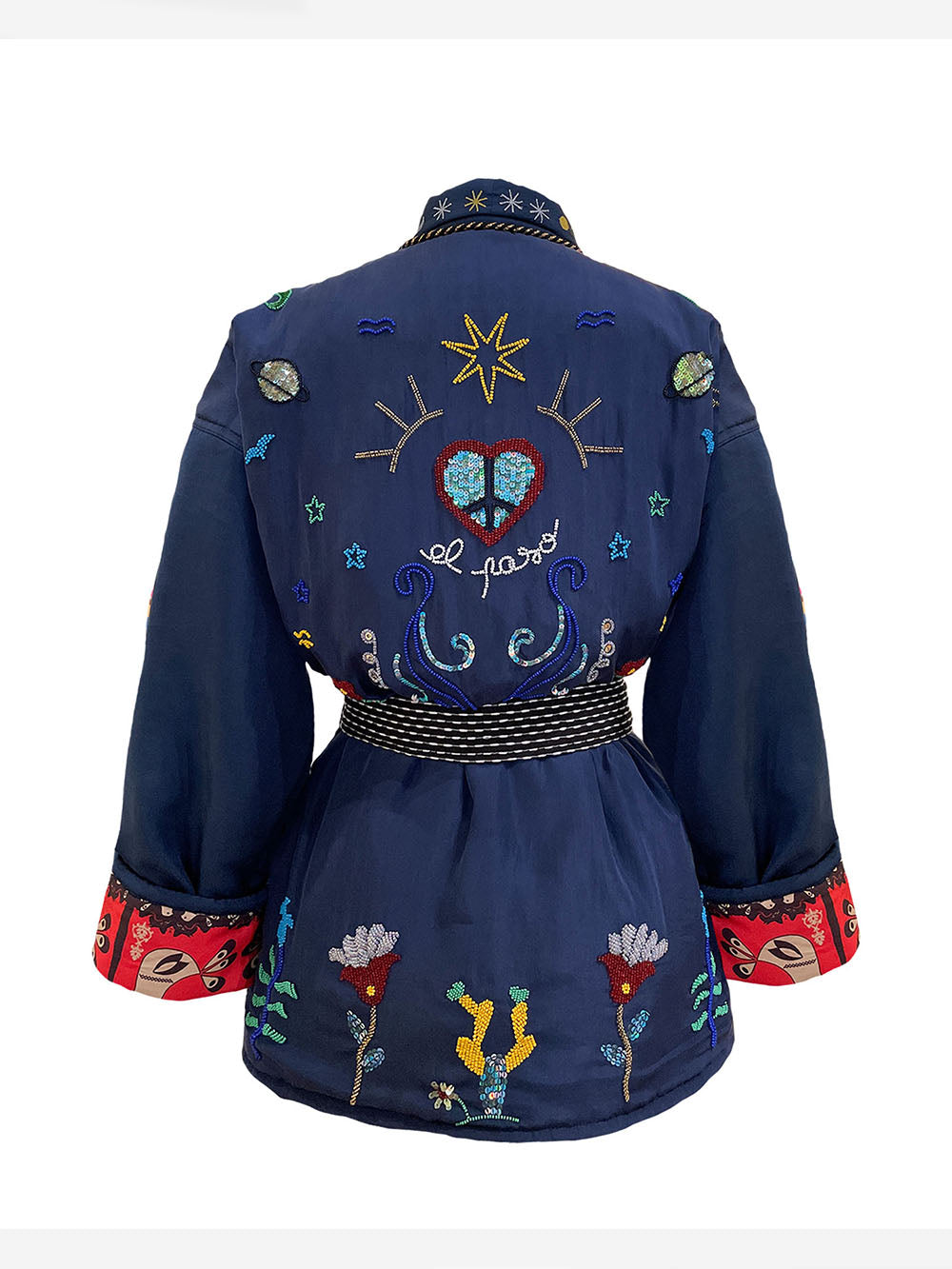This kimono jacket from the Monoki brand is made from vintage cotton quilted and fully lined. This piece is decorated with colorful handmade embroidery, the inscription "el paso" and embroidery adorn the back, you will find two pockets and a belt which tightens the waist and closes the kimono.