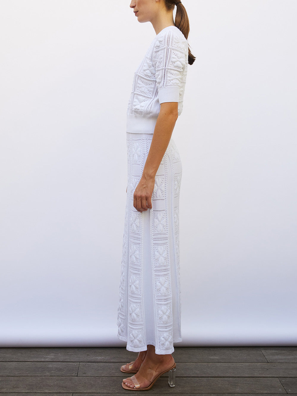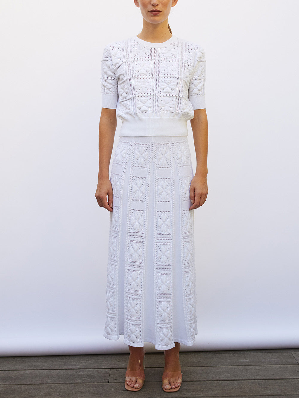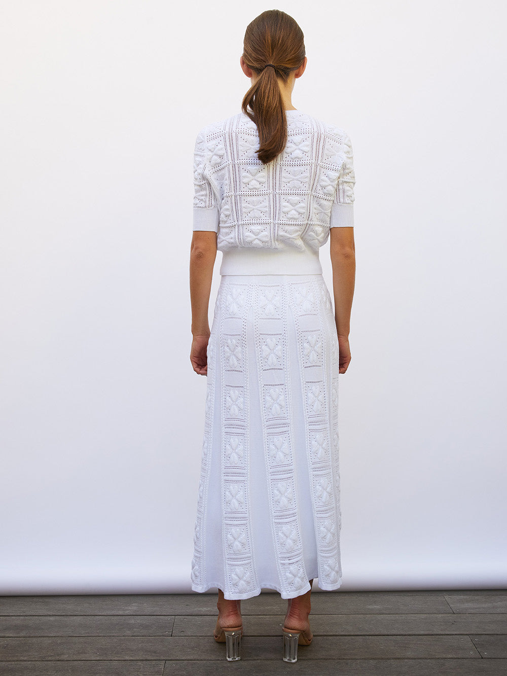 Top Elixir Milk signé Molli tricoté en Italie dans une maille ajourée en coton blanc aux motifs damier accompagné de trèfles en relief. Un top aux manches longueur coude et à la taille élastique ajustée lui donnant un style bouffant.