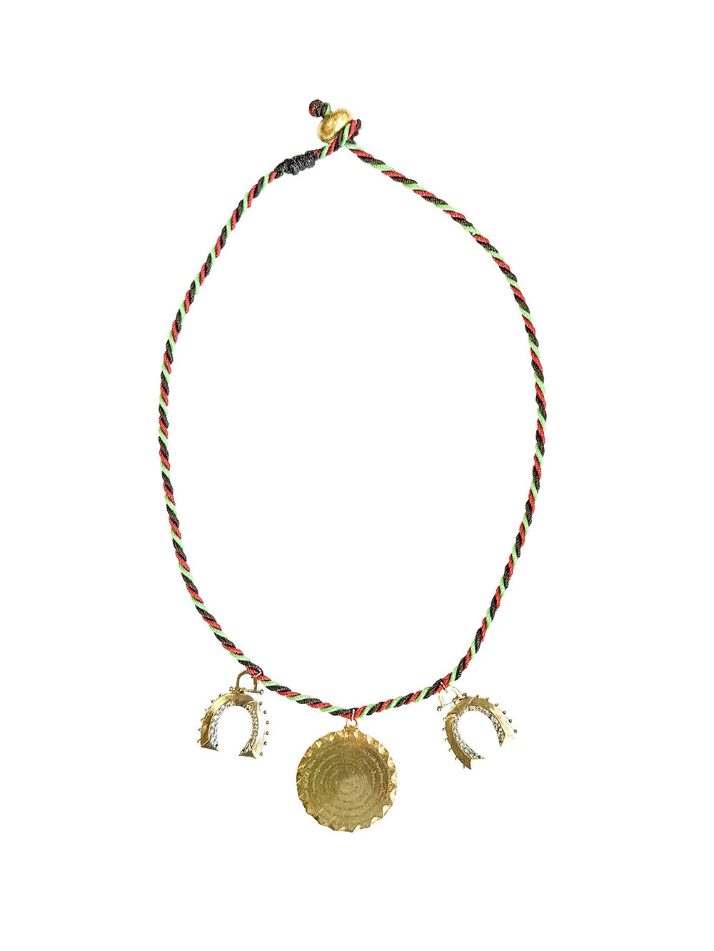 Amen necklace signed Monoki made in red, black and green cotton, ornate with gold metal medallions.
