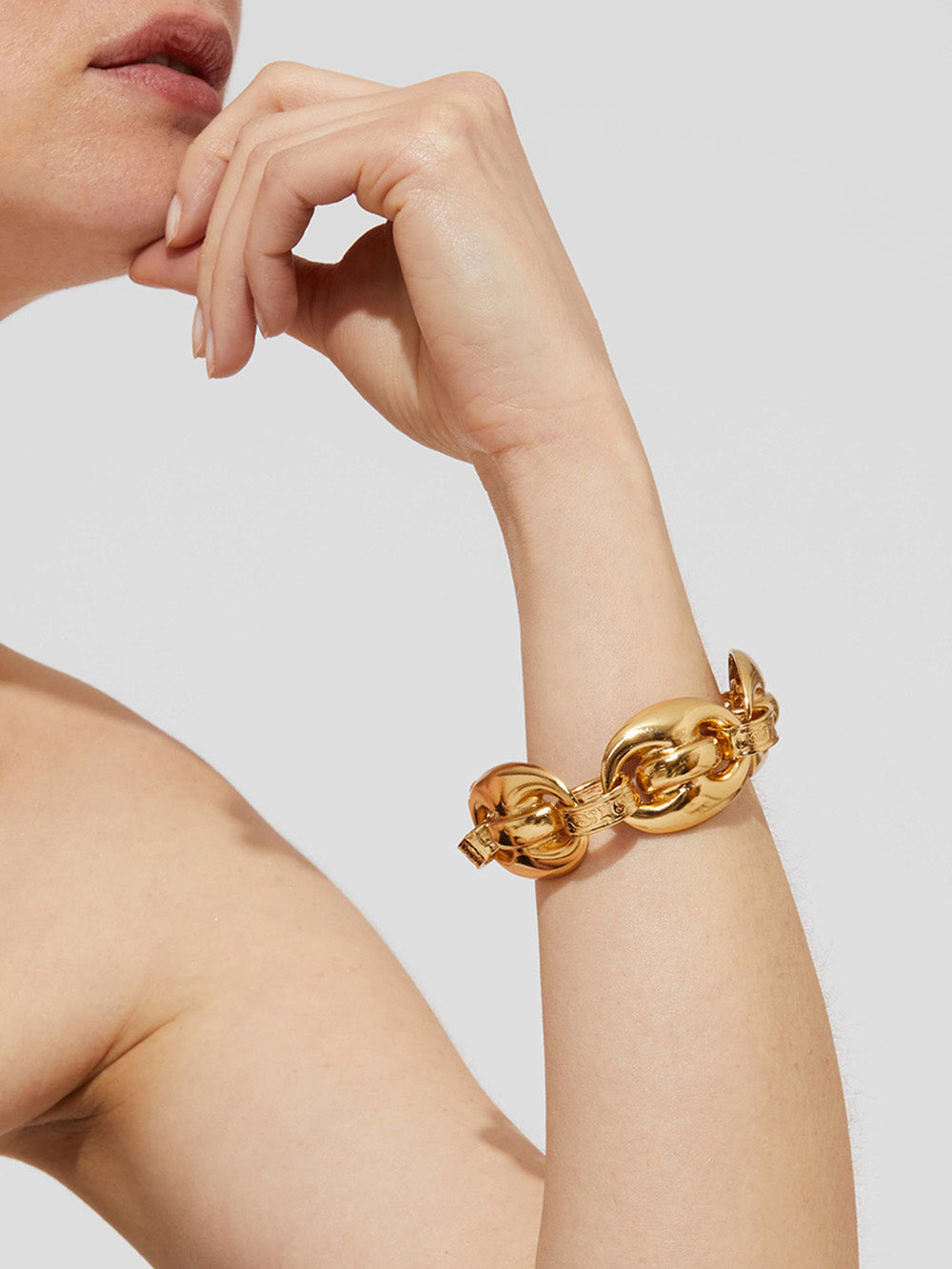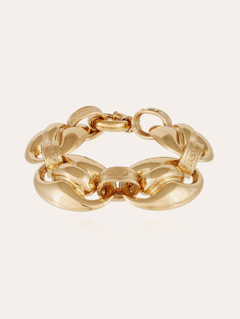 Cophea Gold Bracelet by Gas Bijoux composed of large domed links inspired by marine mesh. Hand-polished pieces linked by delicately engraved rings.