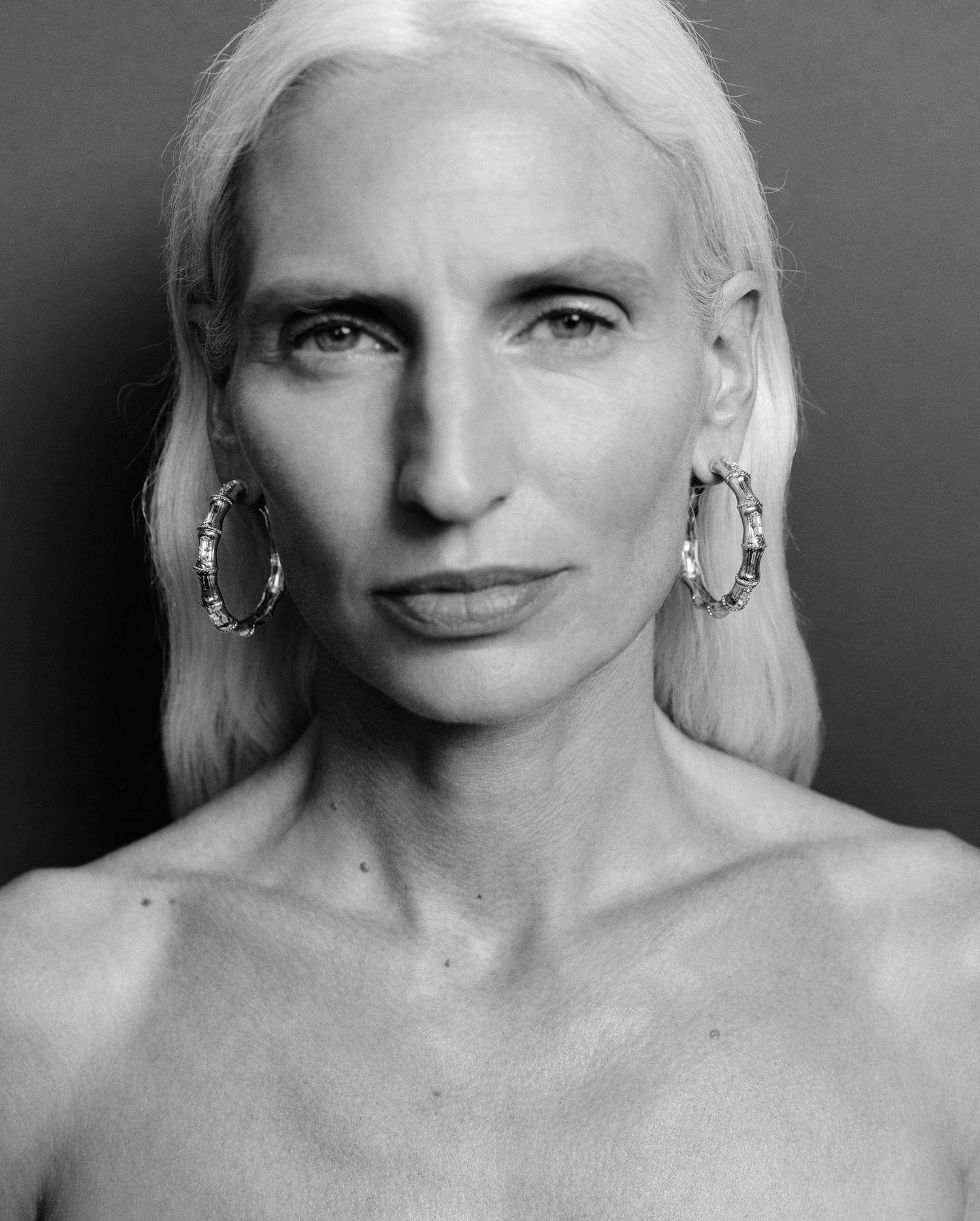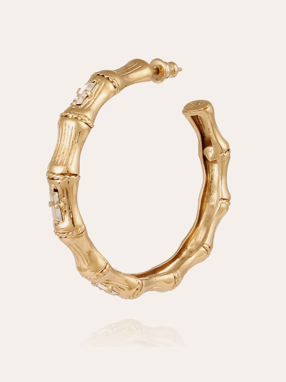 Large Bamboo Creole Earrings by Gas Bijoux made of fine gold-plated metal. A pair of striated earrings set with rhinestones. André Gas draws inspiration from this tropical plant, emblematic of the paths and beach huts of Saint-Tropez, to reinvent the iconic bamboo motif.