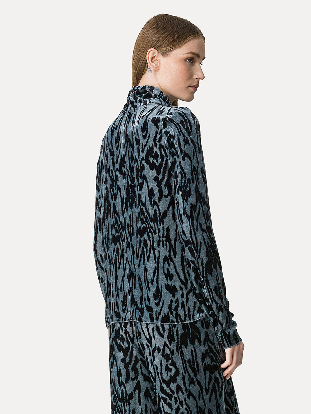 Turtleneck by Forte_Forte made from a blue-grey and black tiger-print moiré velvet fabric. A long-sleeved top with a straight cut.