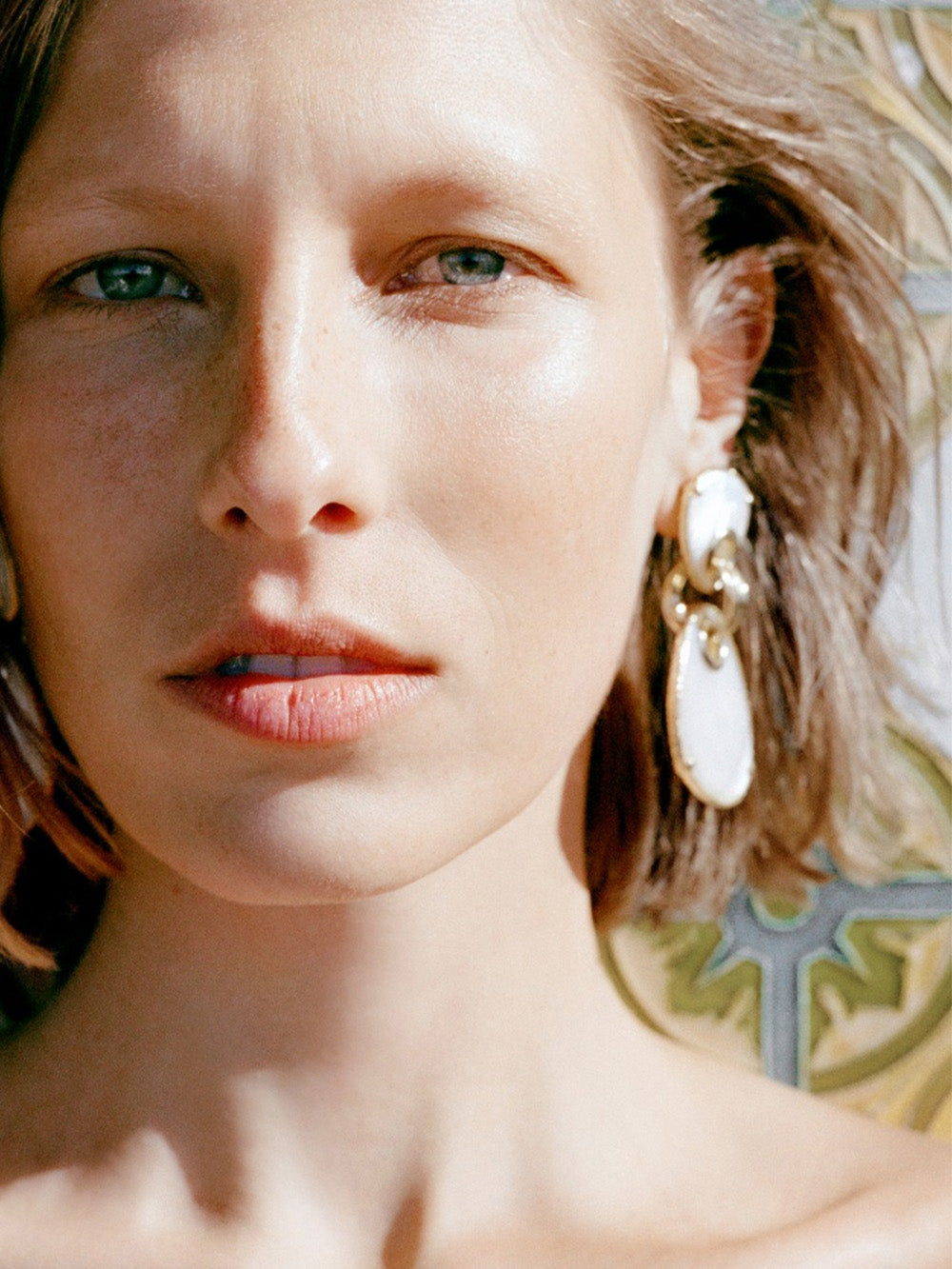 Gold-plated earrings composed of two white mother-of-pearl medallions connected by a delicately hammered central ring.