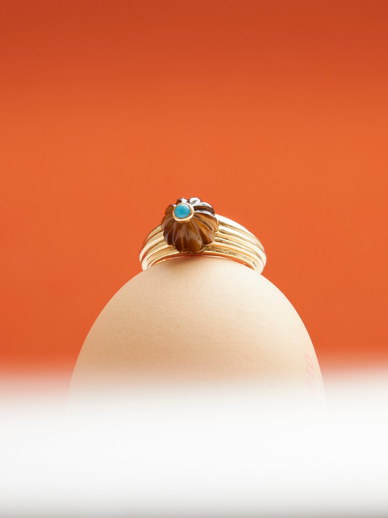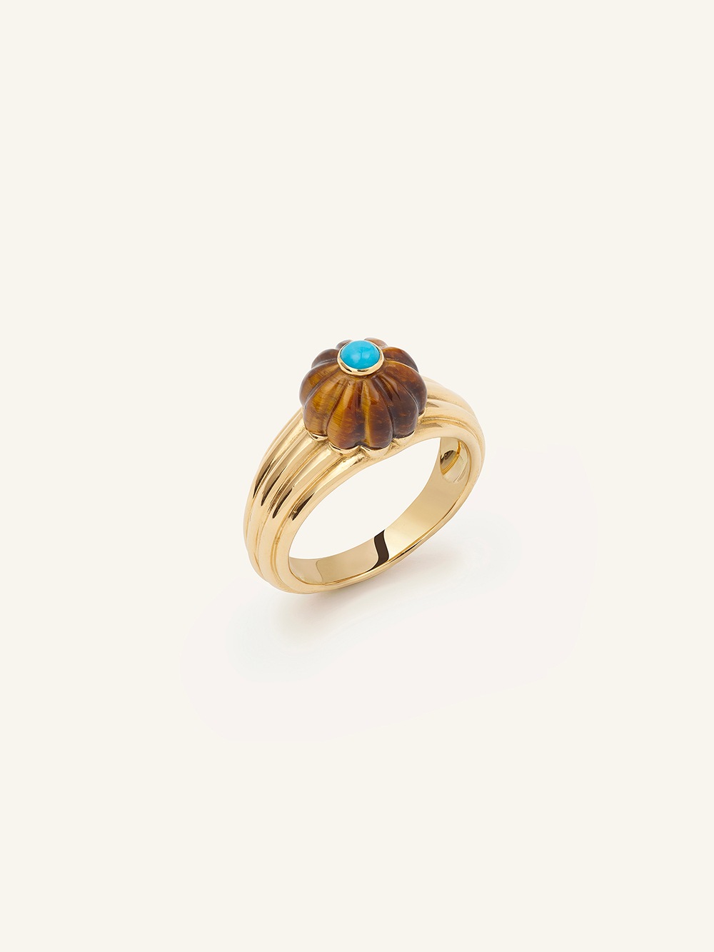 This tiger's eye and turquoise Gelato ring was designed by designer Salomé Rico. It consists of a half melon cut in tiger's eye with turquoise cabochon and an 18 carat gadrooned yellow gold ring. Handmade in Paris, this strong piece reflects the DNA of the house.