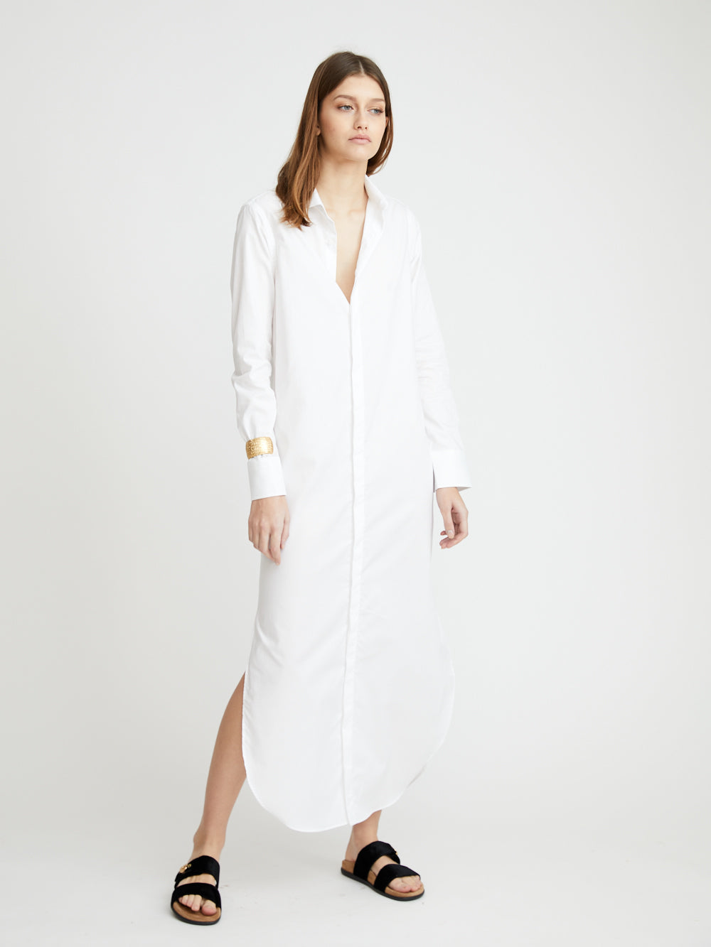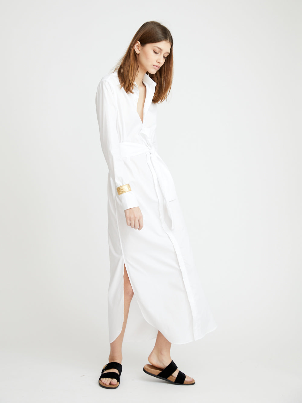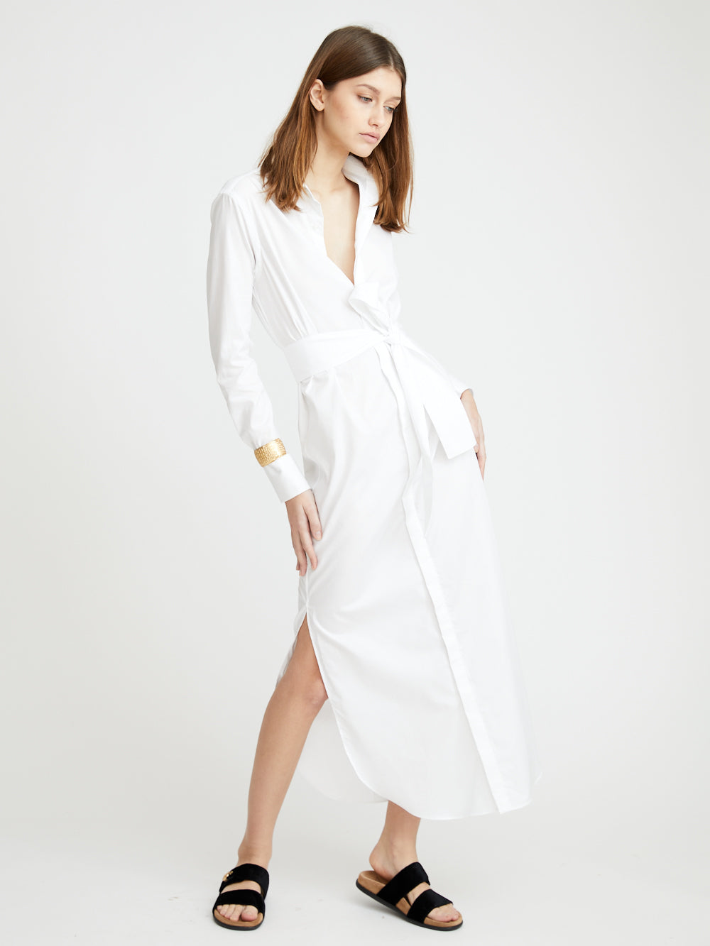 The Blanket shirt dress by Faliero Sarti is a long shirt dress. This model is in white cotton has long sleeves, a classic shirt collar, buttoned cuffs and side slits. This piece offers a removable tone-on-tone belt to wrap around the waist.