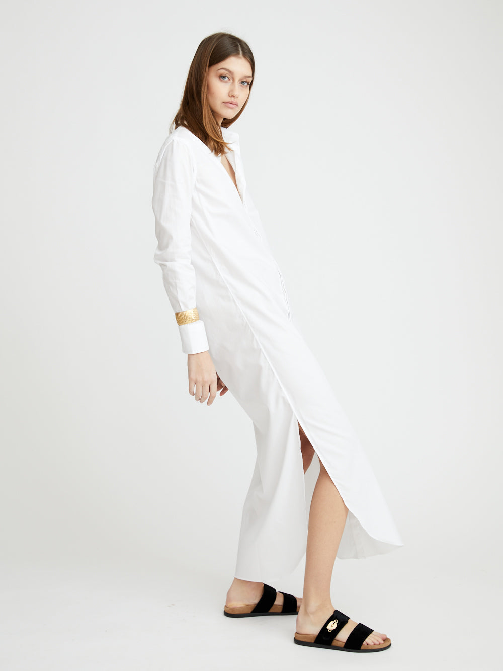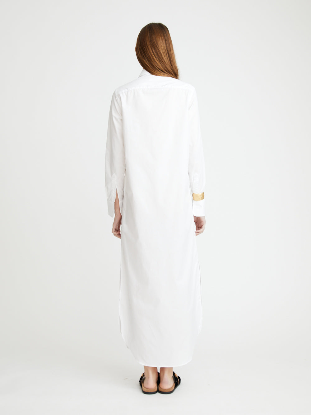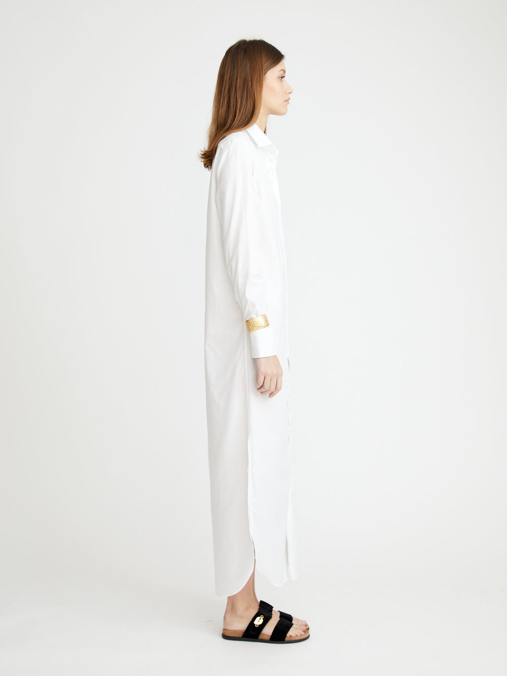 The Blanket shirt dress by Faliero Sarti is a long shirt dress. This model is in white cotton has long sleeves, a classic shirt collar, buttoned cuffs and side slits. This piece offers a removable tone-on-tone belt to wrap around the waist.