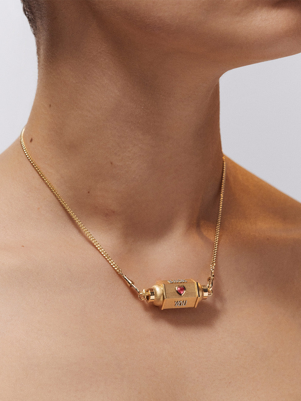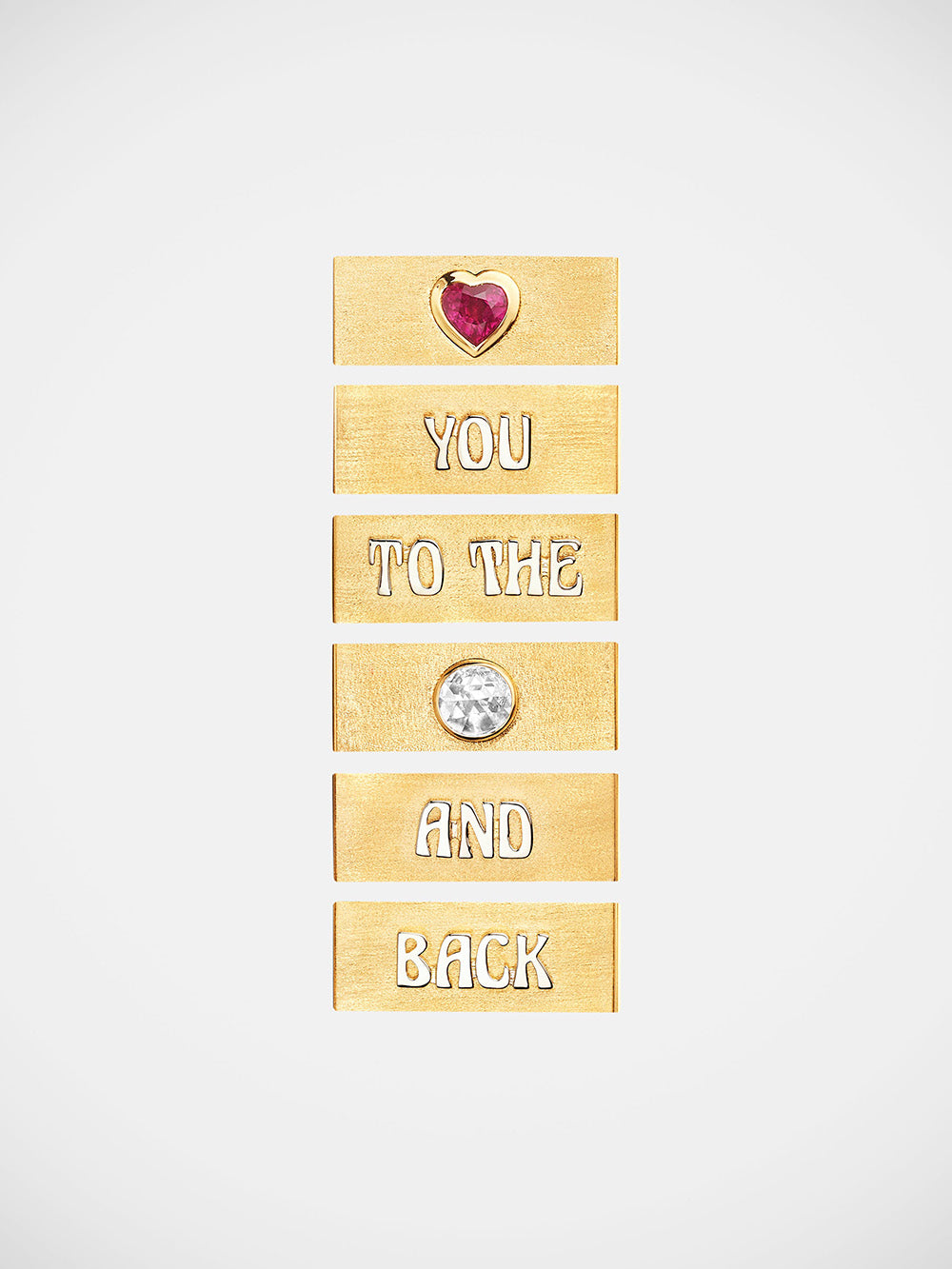 Marie Lichtenberg's Love You Coco Locket is crafted in 18-carat brushed yellow gold, set with a rose-cut diamond and a heart-shaped ruby. The necklace features the graphic phrase "Love you to the moon and back." - Weight: 15 grams - Ruby: 0.28 carat - Diamond: 0.24 carat - Locket size: 3cm x 1.5cm - Part guaranteed for 2 years from the date of purchase upon presentation of the invoice - Sent in a jewelry box with certificate of authenticity