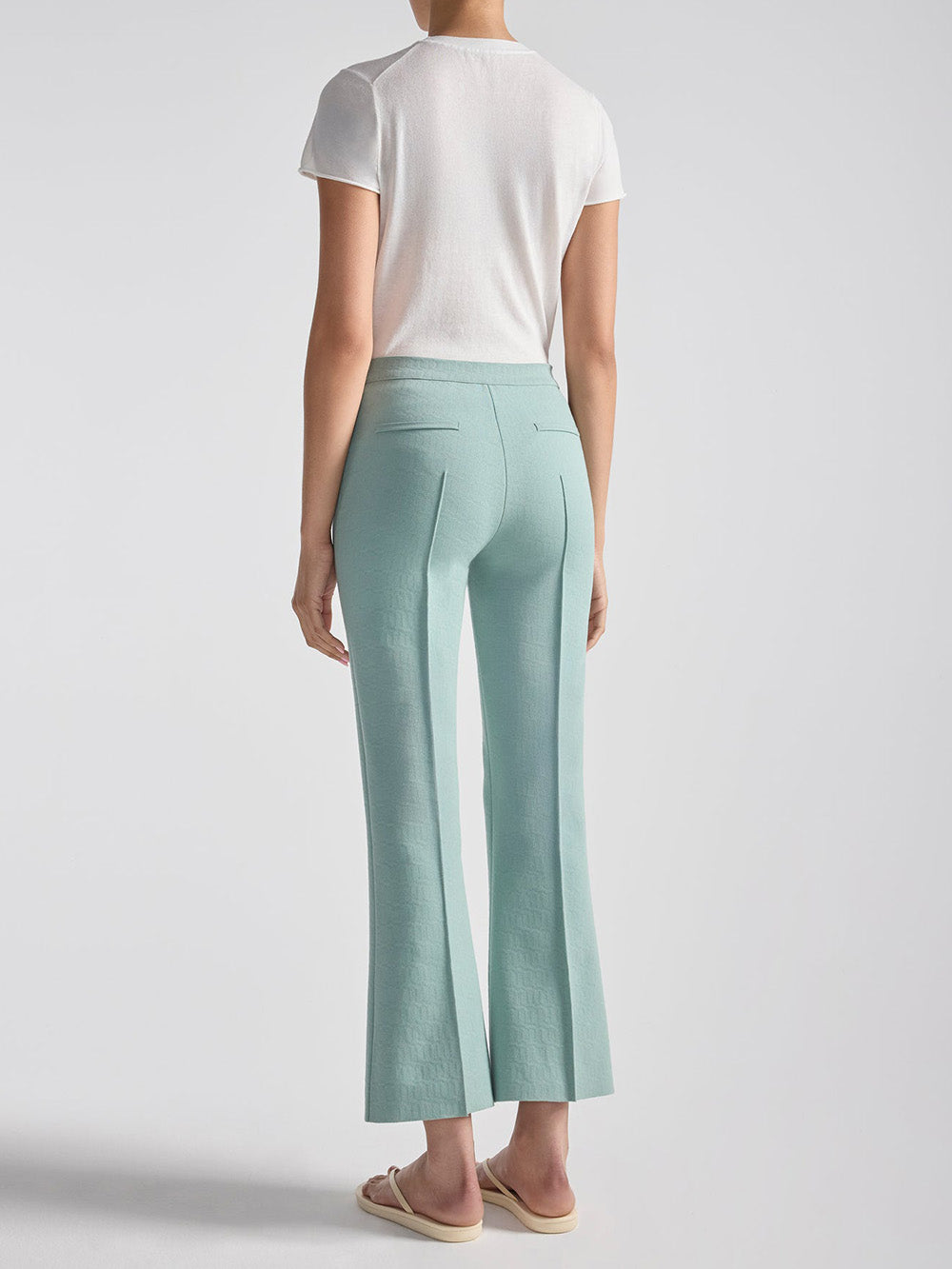 Geo Kick pants by High Sport, crafted from sage-colored Italian cotton. These 7/8 pants are fitted and flared at the leg.