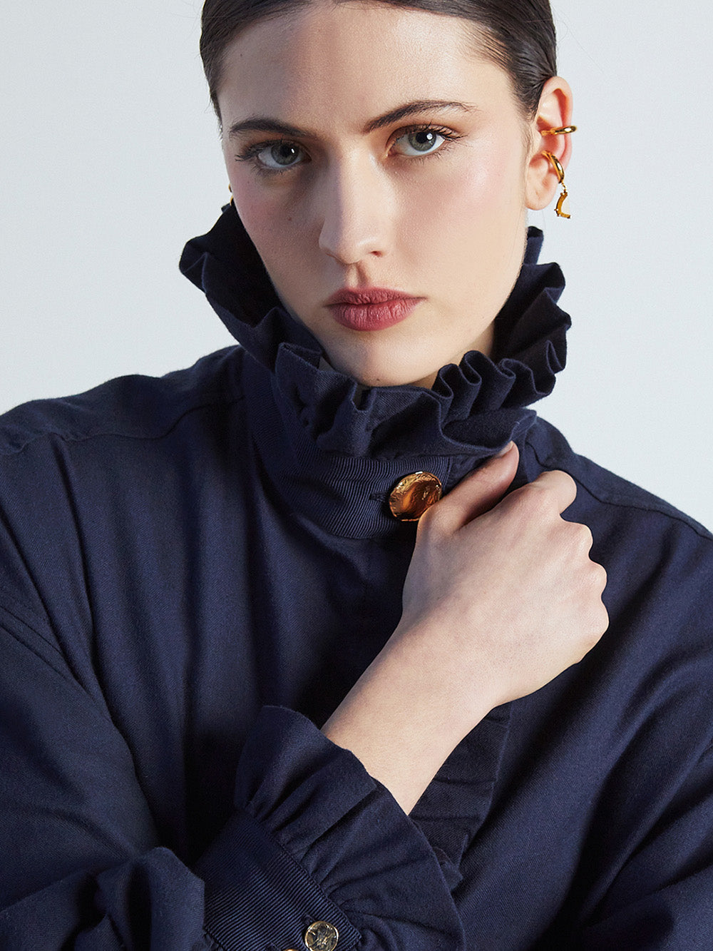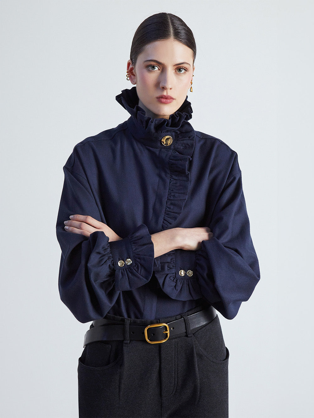 Ezra Hudson shirt by The Label Edition, crafted from navy blue cotton. An elegant and timeless blouse with plenty of volume.