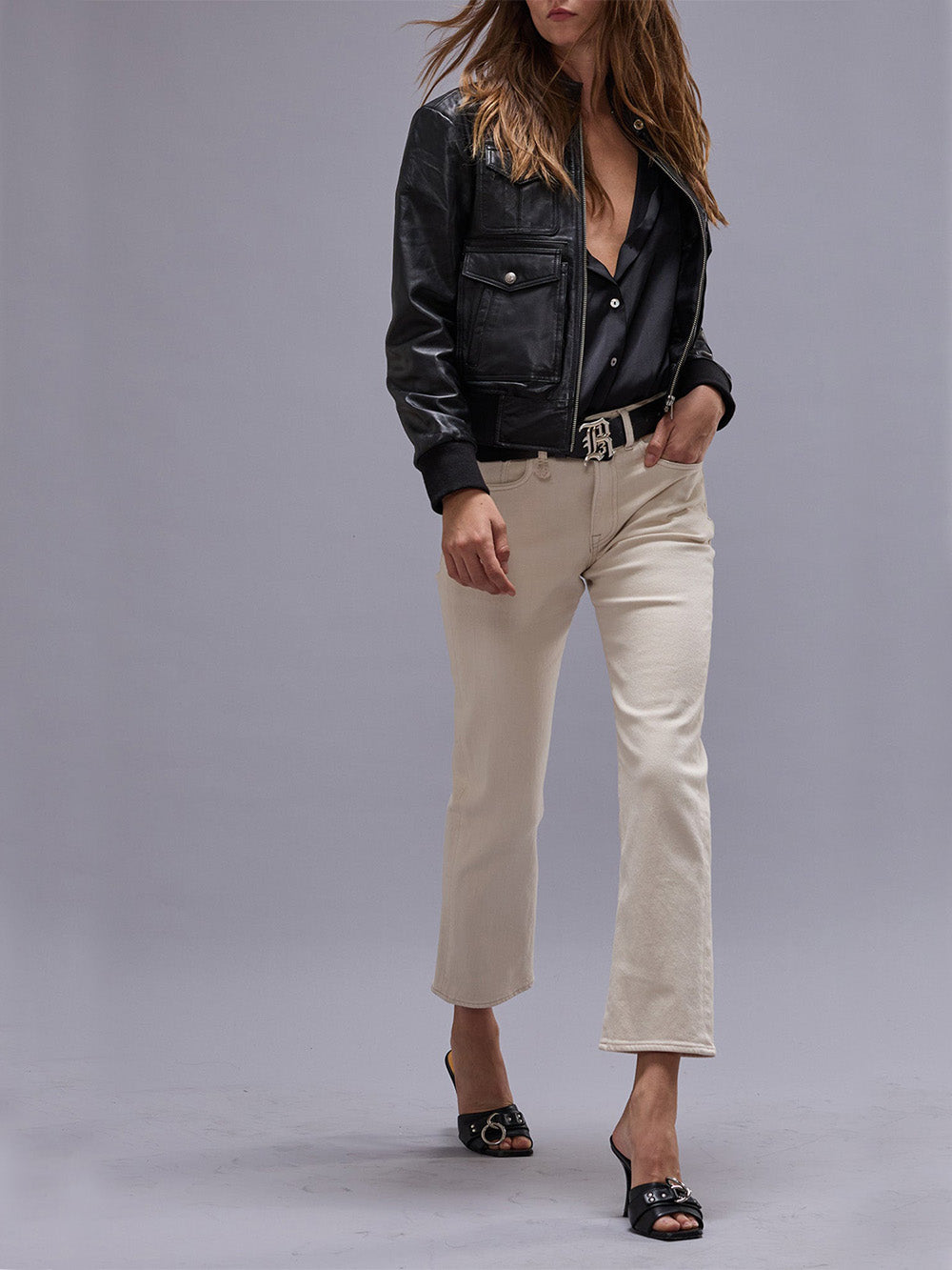 R13 Romeo jeans made from off-white Japanese cotton canvas. A straight, close-fitting cut with a mid-rise waist and ankle length.