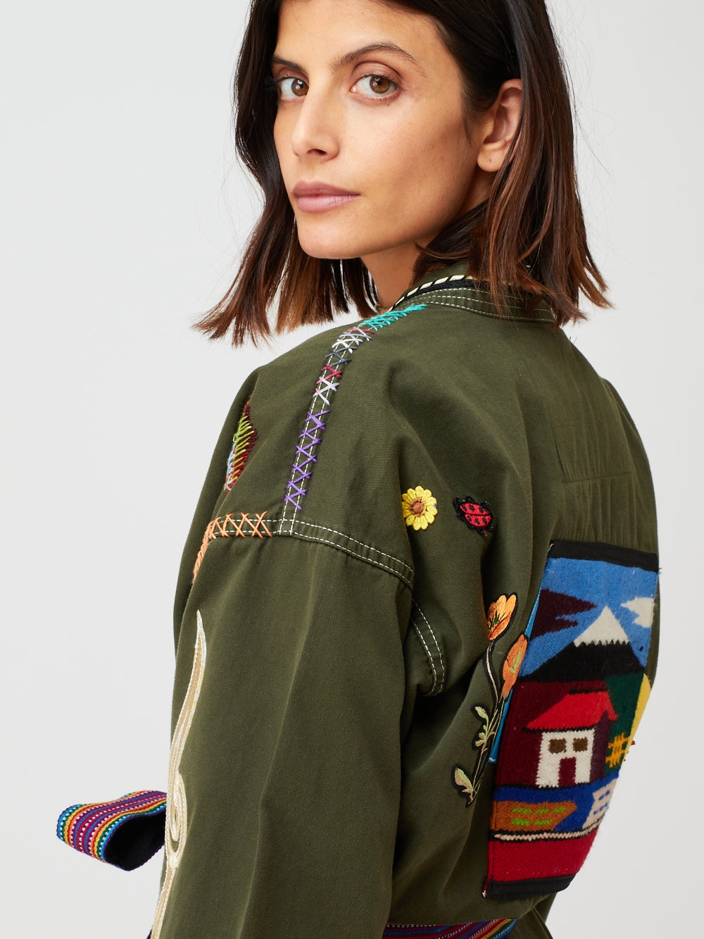 Monoki Kimono Voyageur. This cotton kimono jacket is decorated with handmade embroidery on the theme of travel. The piece has two leather pockets and embroidery on the collar. A Guatemalan embroidered belt tightens the waist and closes the kimono. Monoki creations are one-of-a-kind pieces created by designer Diane Goldstein and blessed by a shaman in Big Sur, California. Each model can have variations in the realization compared to the photo.