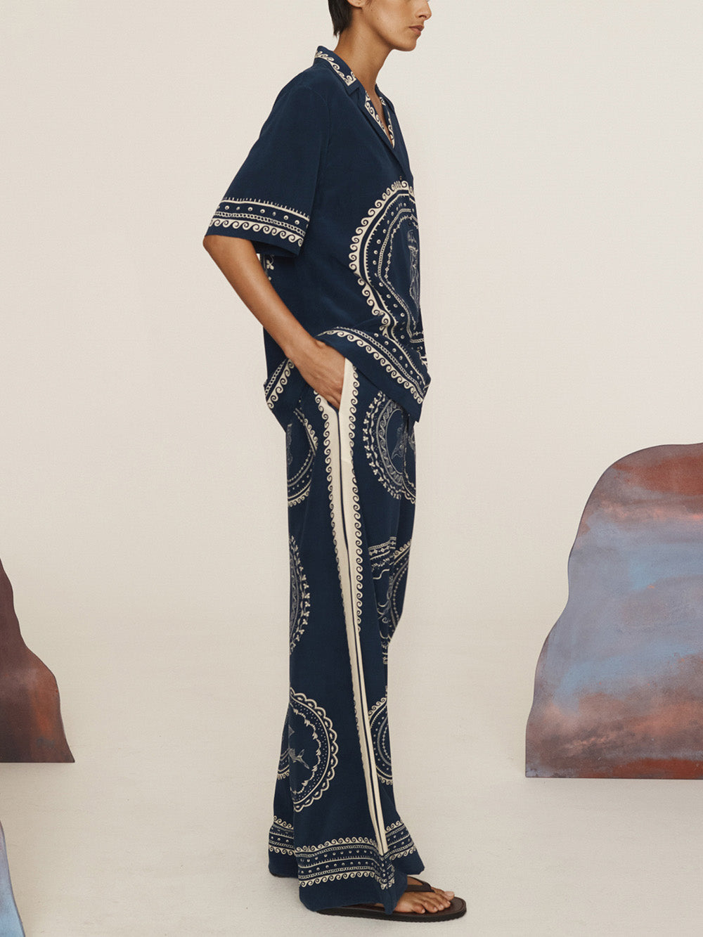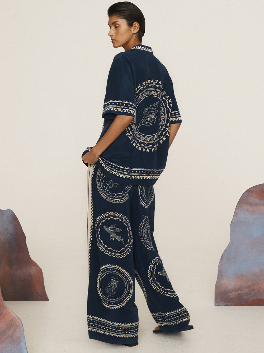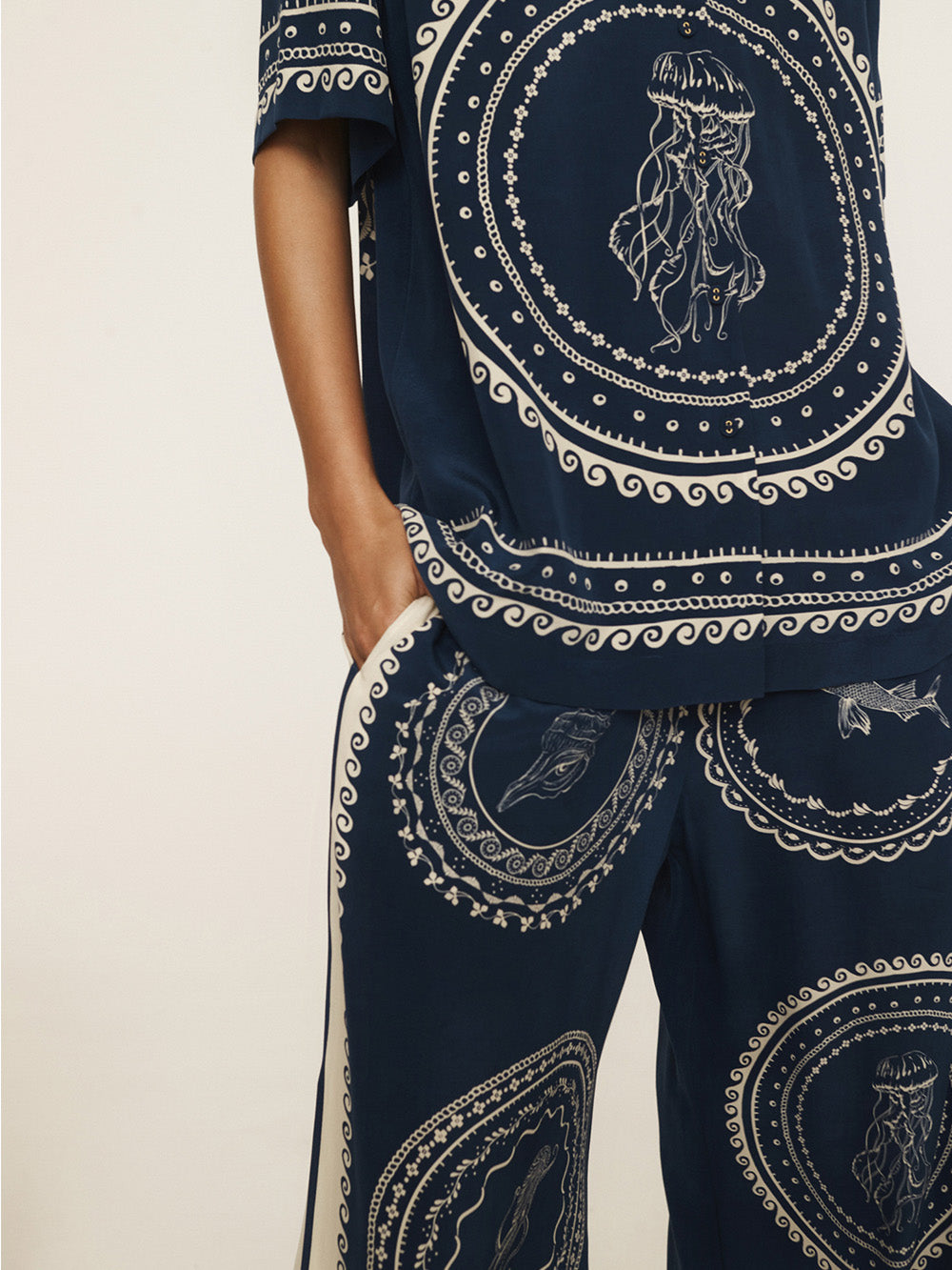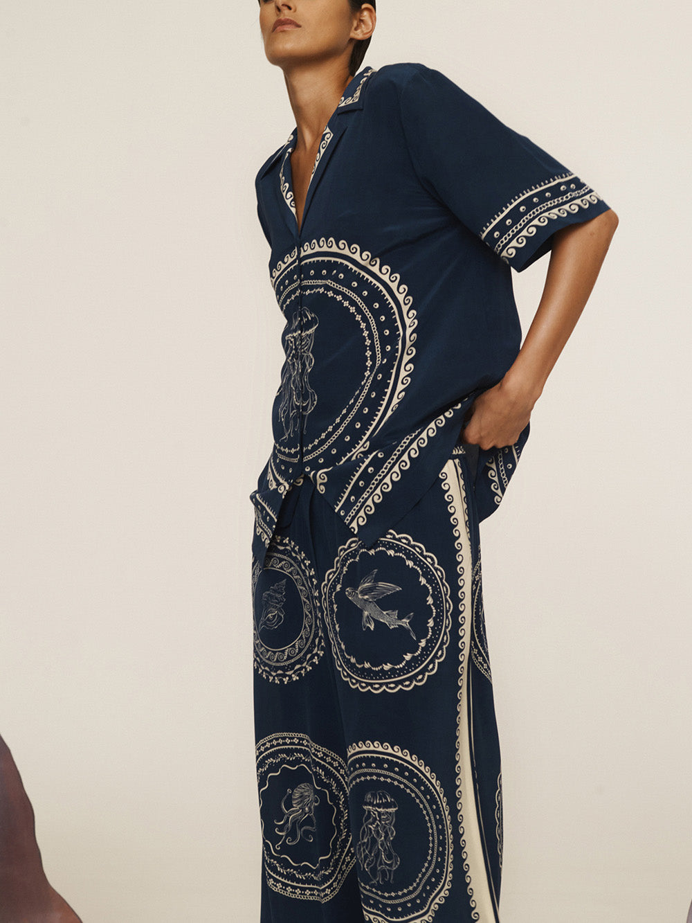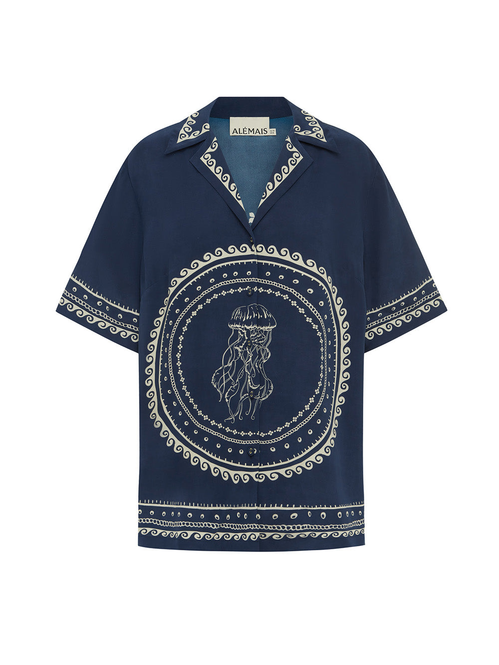 Oceane shirt by Alémais, crafted from navy blue silk printed with cream-colored nautical and geometric patterns. A straight-cut shirt with short sleeves.