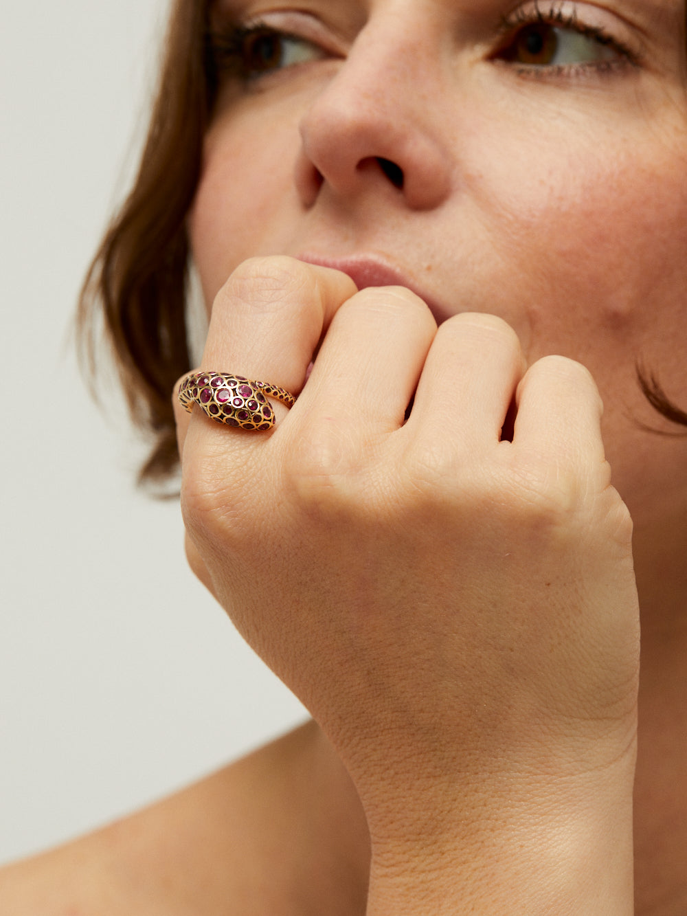 This Basilik ring by Selim Mouzannar is handmade in Lebanon. It consists of an 18-carat yellow gold ring set with rubies, taking the shape of a snake. A stunning piece named "Basilik" in homage to the king of snakes.
