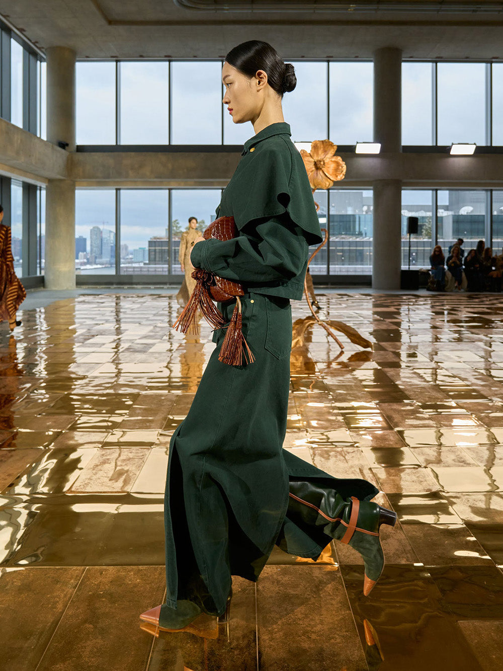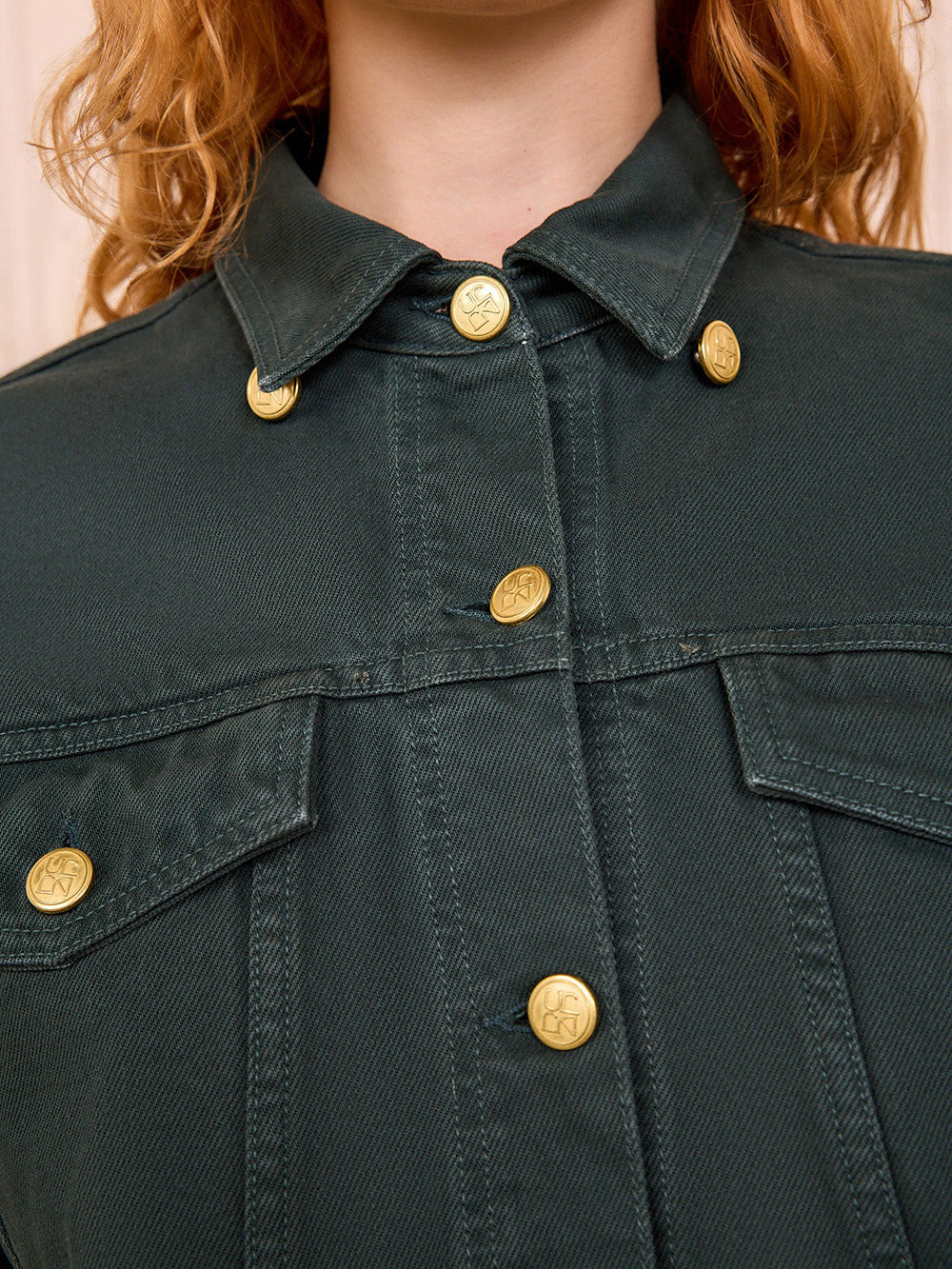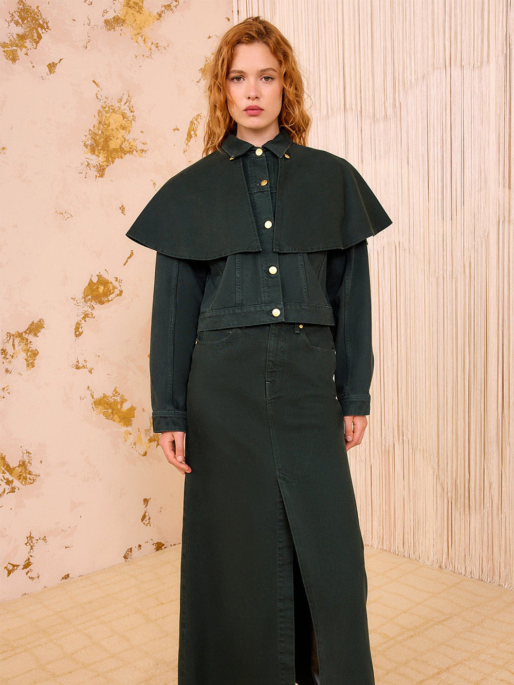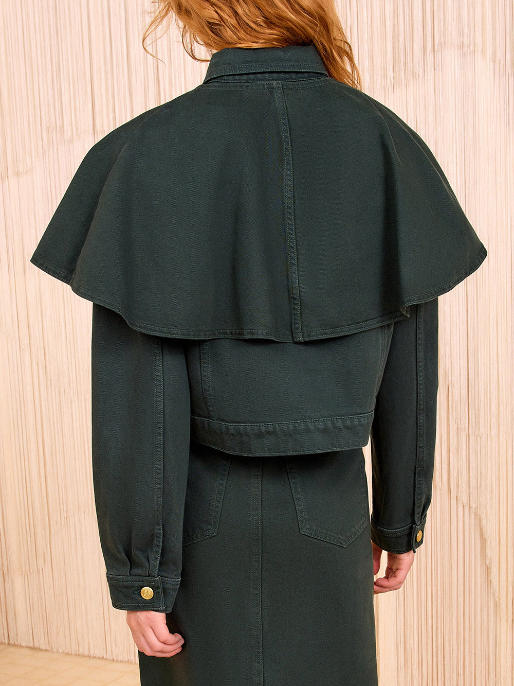 Ulla Johnson's Agata Hunter Denim Cape is crafted from forest green cotton canvas. A button-front denim jacket with a detachable matching cape for a versatile look.
