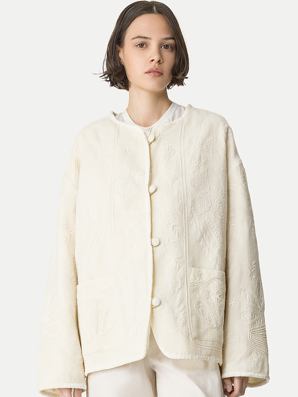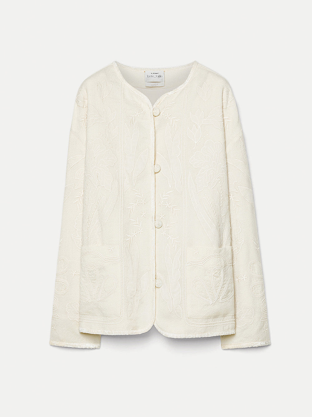 The Iris Bianco jacket by Forte_Forte is crafted from off-white wool and embroidered with plant-inspired appliqués. This lightweight jacket features a button-front closure and velvet trim.
