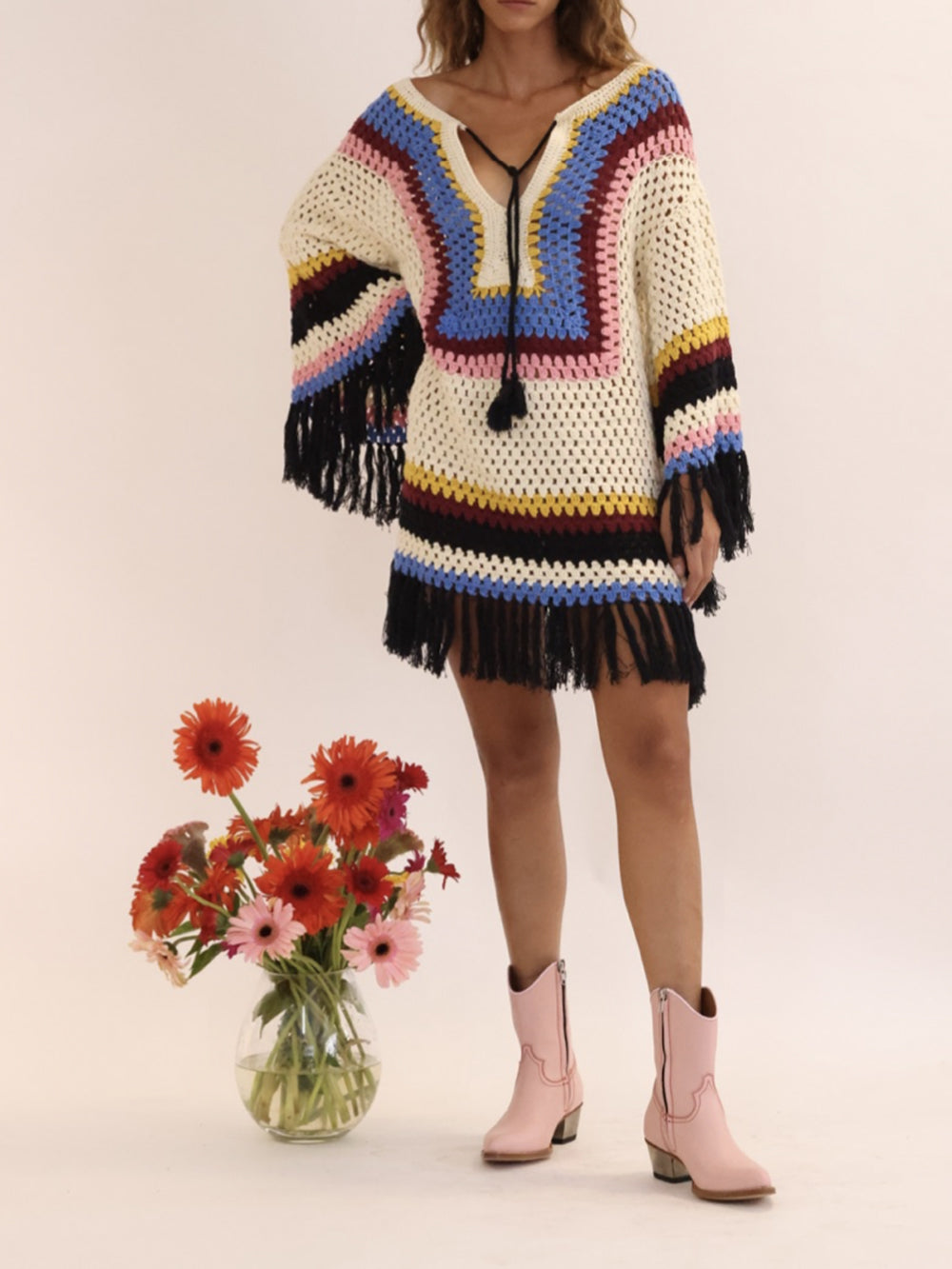 The Byond dress by Dodo Bar Or is designed in handmade crochet with multicolored bands.