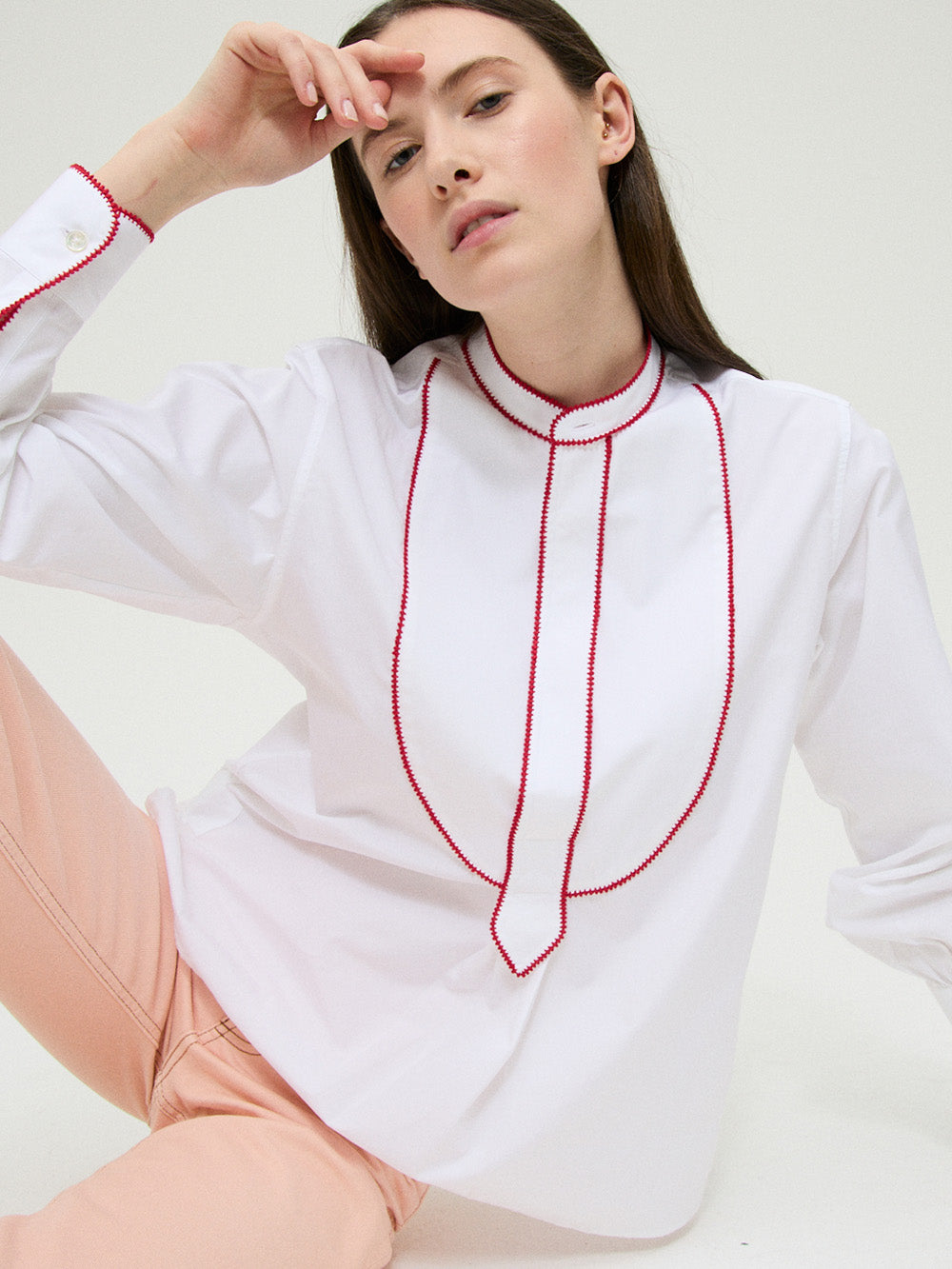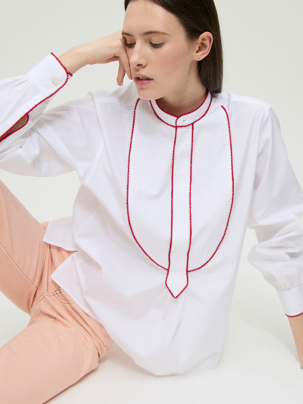 The Painter Venetian shirt by Sébline is made from white Italian cotton poplin decorated with contrasting red stitching. The shirt's cut is inspired by painter's smocks.