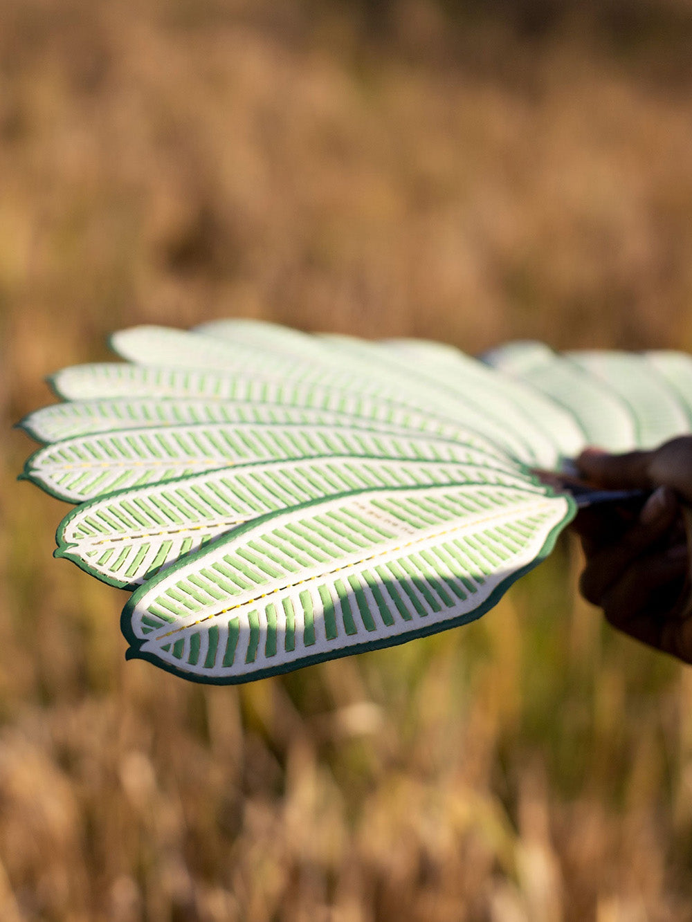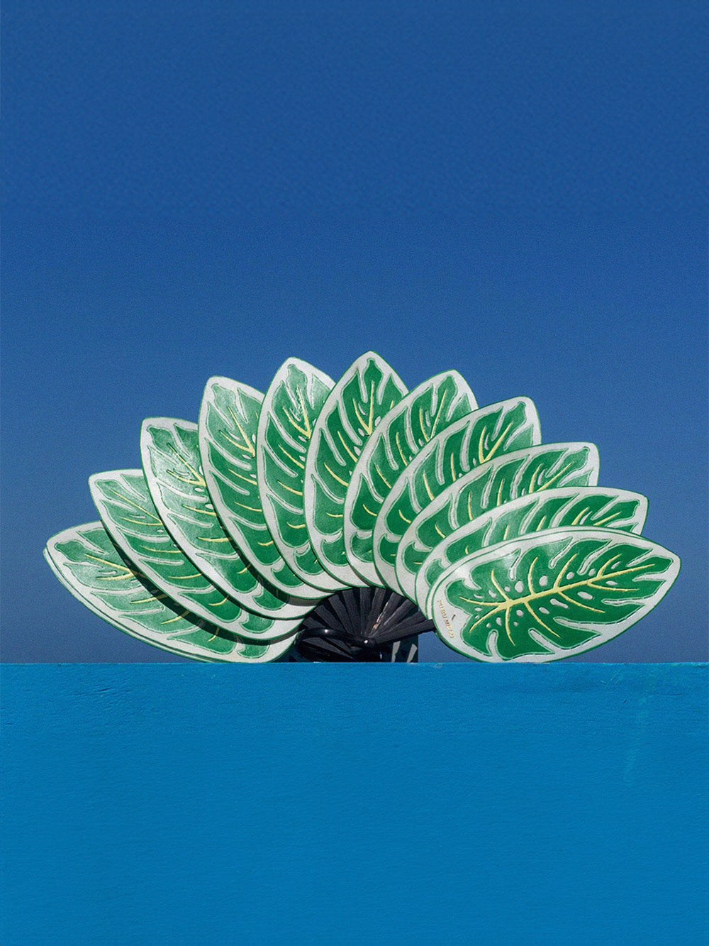 Éventail Monstera signé Pu Bu Mé Su confectionné en cuir tendu et séché au soleil puis peint et découpé à la main. Un design inspiré des fruits pendants dans les marchés.