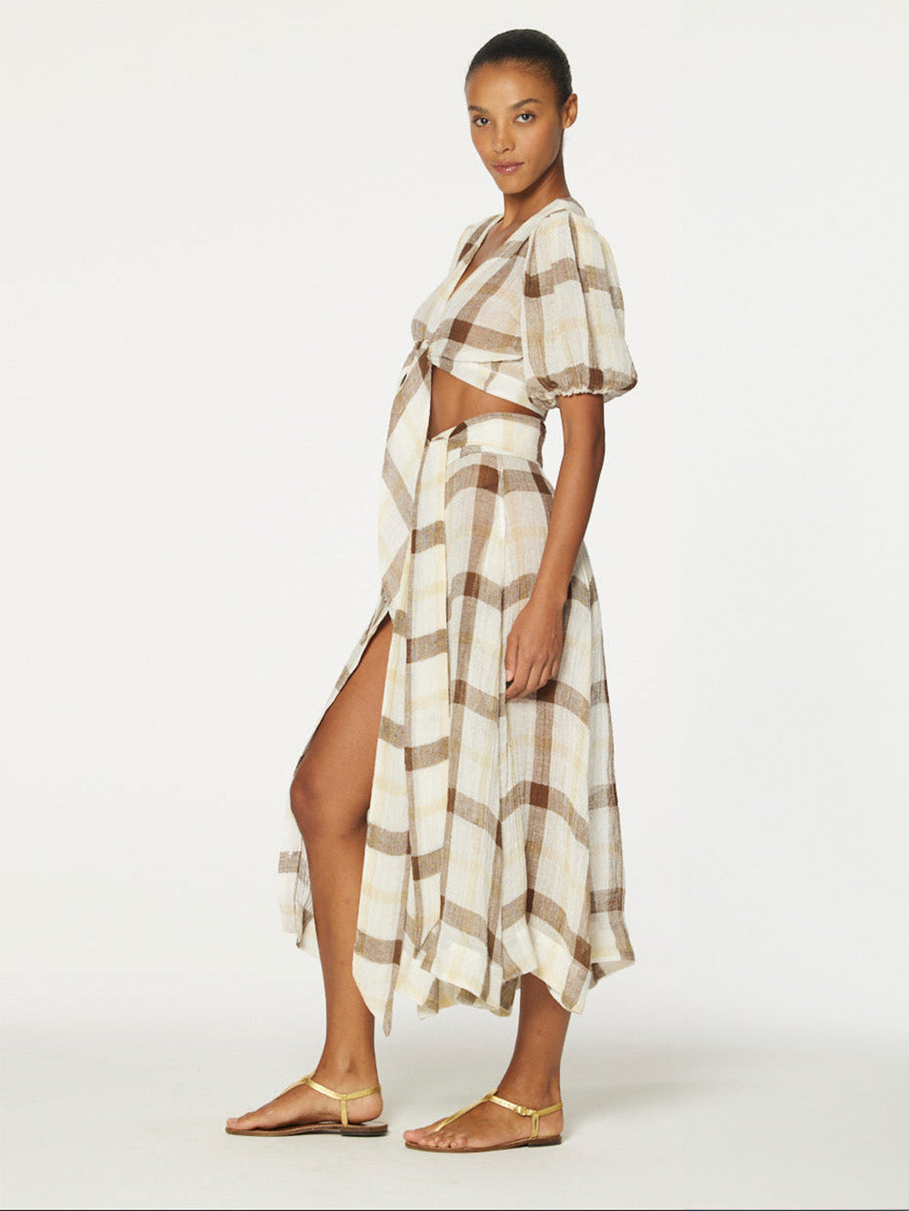 Beach skirt by Lisa Marie Fernandez, crafted from cream-colored linen with a brown check pattern. A midi-length skirt with an asymmetrical hem and buttons down the front.