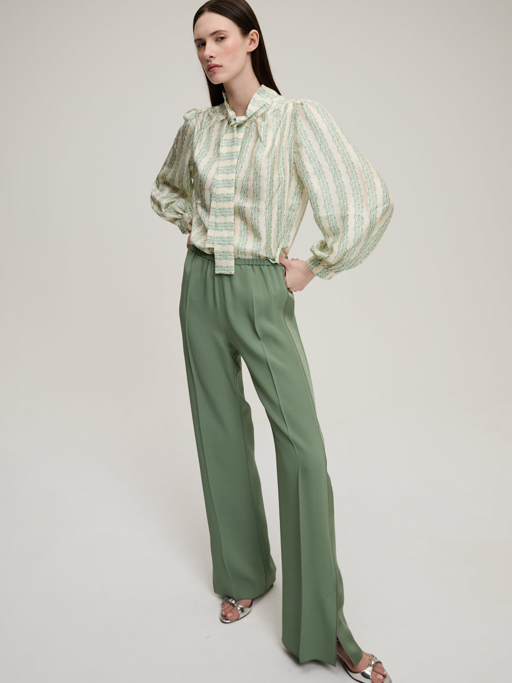 Khaki satin trousers by Forte_Forte, crafted from a light green satin fabric. These straight-leg, flared trousers feature side slits and a satin stripe running the length of the leg.