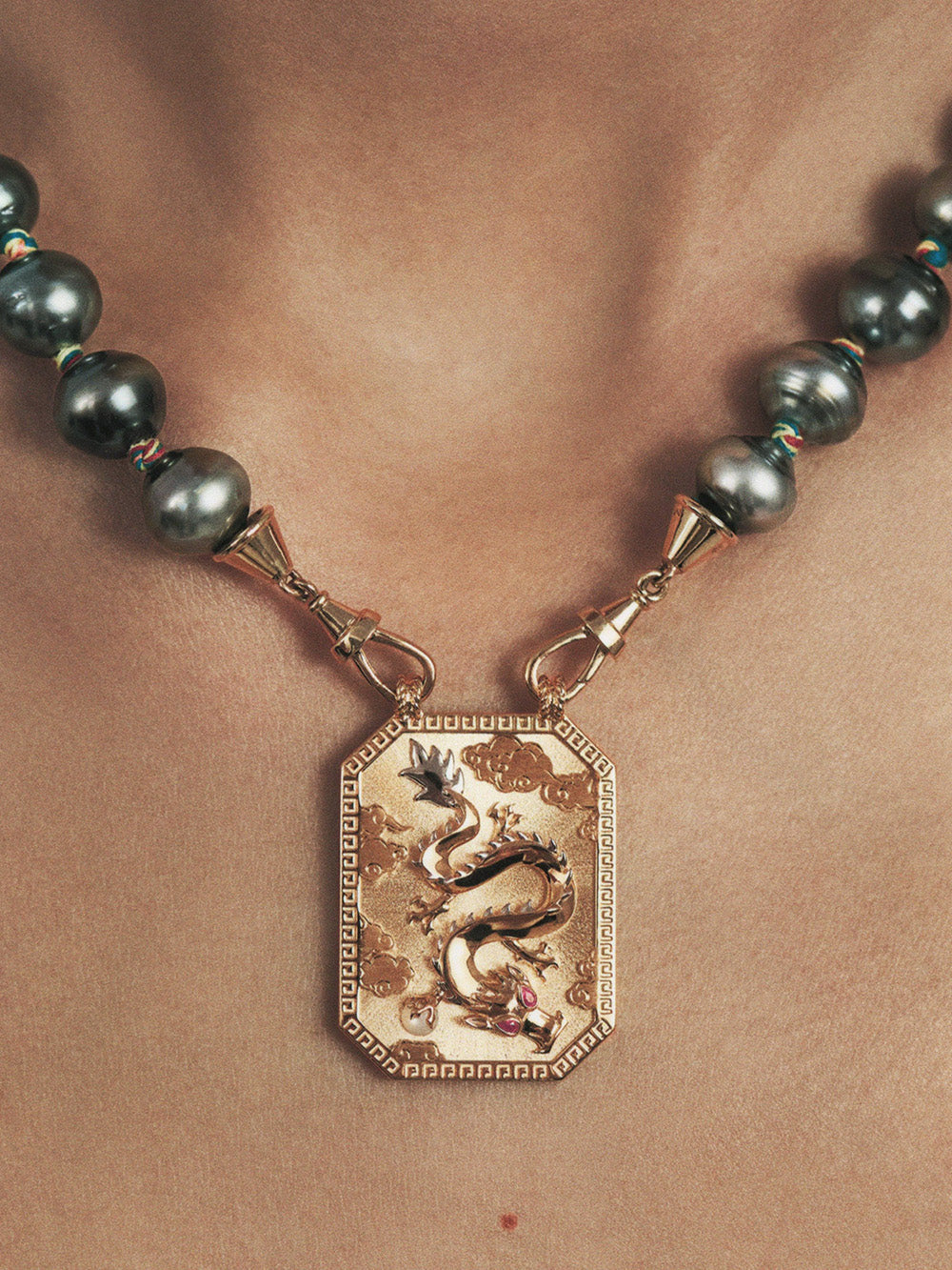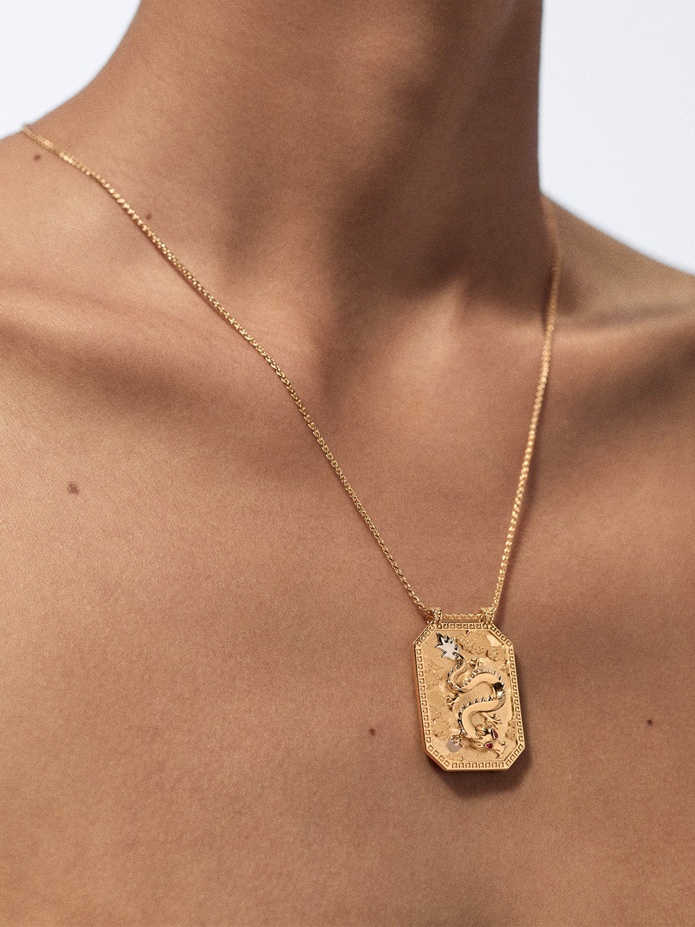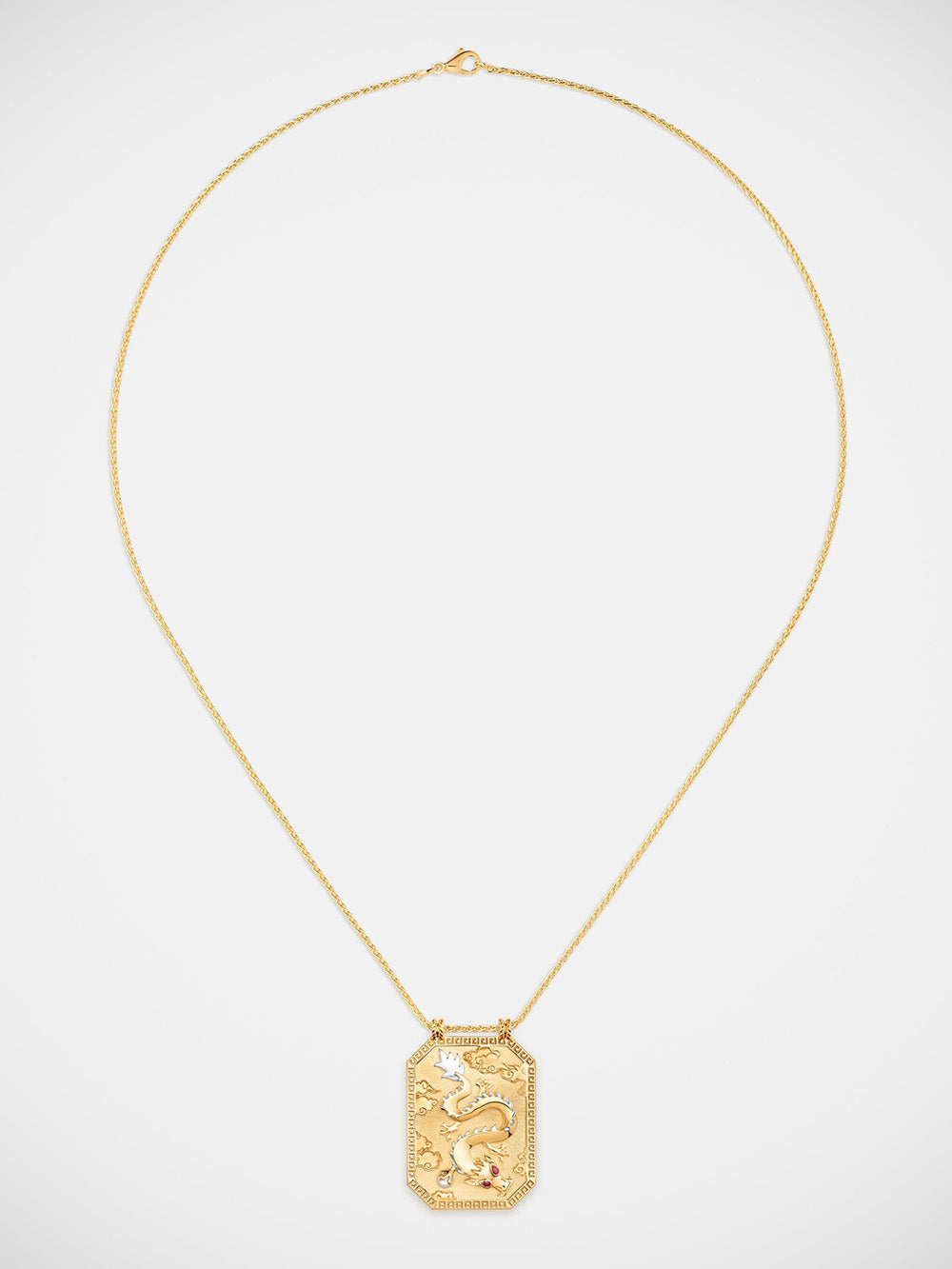 Gold Dragon Scapular signed Marie Lichtenberg crafted in 18-carat yellow gold decorated with clouds and a dragon whose eyes are set with two pear-cut rubies and whose claws contain a white pearl.