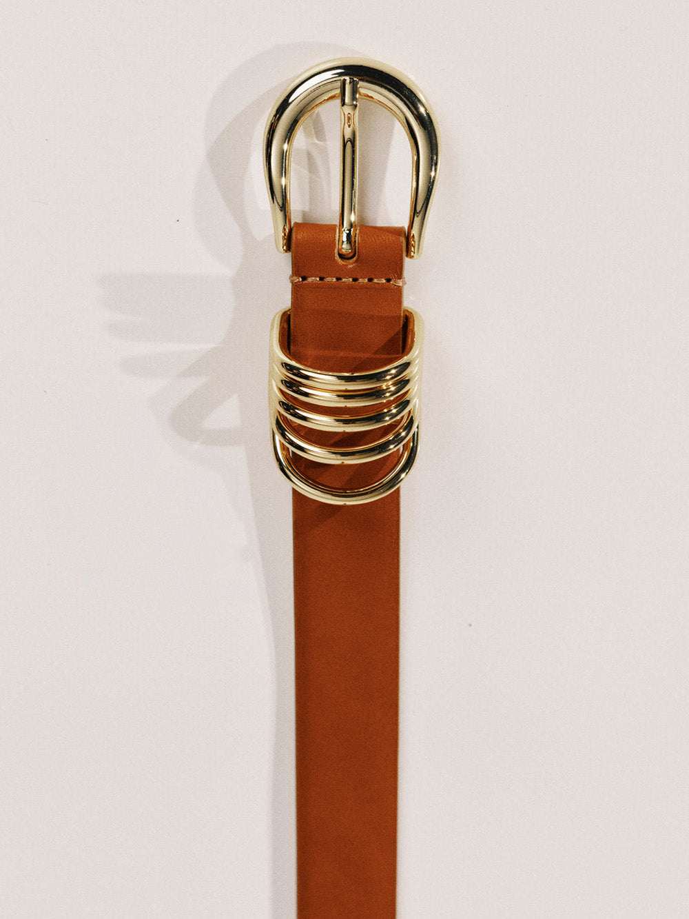 The Hollyhock belt by Déhanche is crafted from smooth caramel leather with 24-karat gold-plated metal accents. Its style is enhanced by five minimalist rings.
