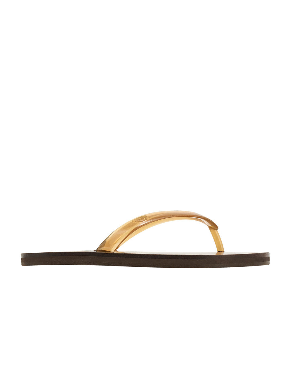 Saionara Jelly sandals by Ancient Greek Sandals are crafted from transparent caramel rubber mounted on a black leather sole.