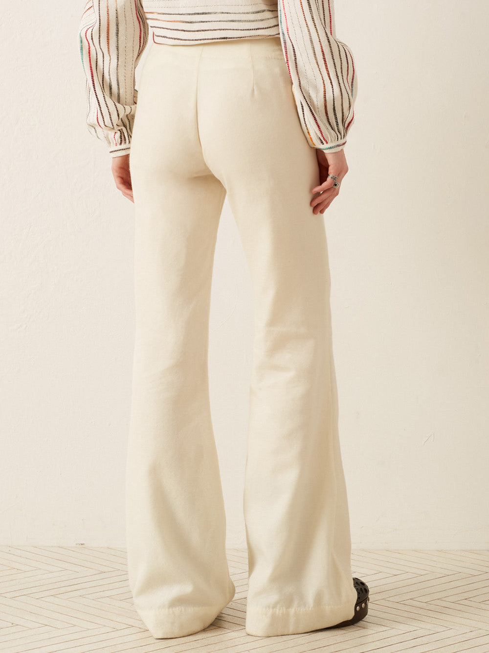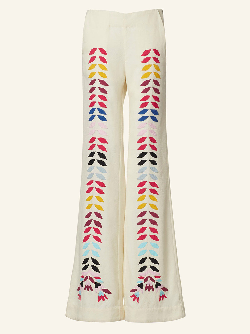 The Charlie Ivory Prism trousers by Alix of Bohemia made of ivory wool; Hand embroidered decorations in multicolored leaves. Inspired by the 1970s fashion style with narrow hips and slightly flare leg.